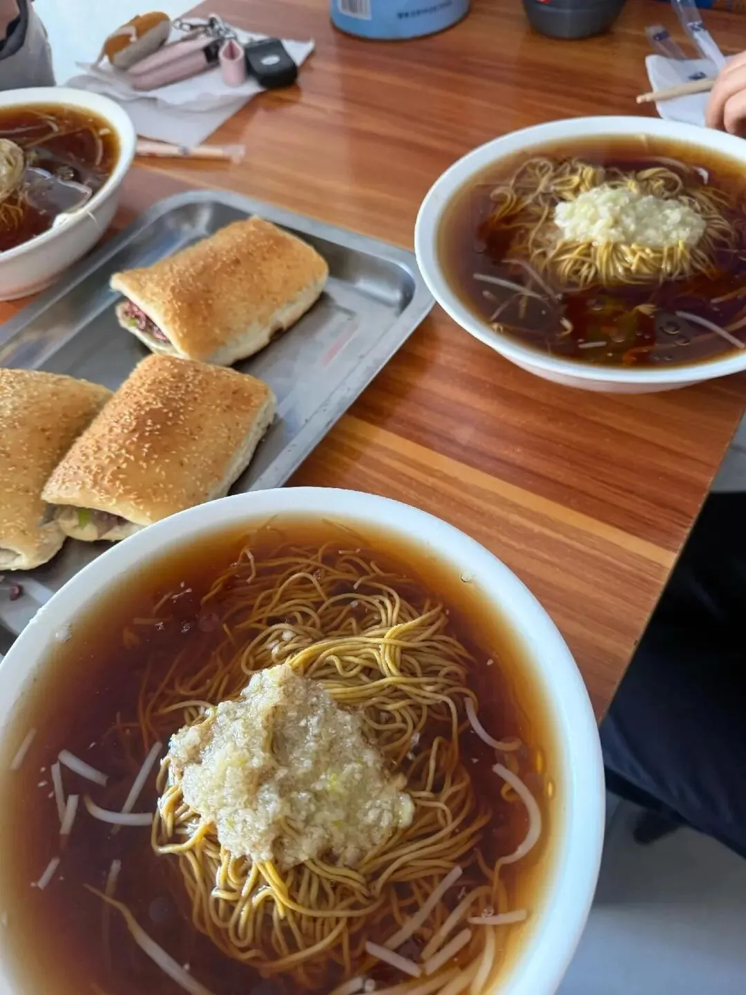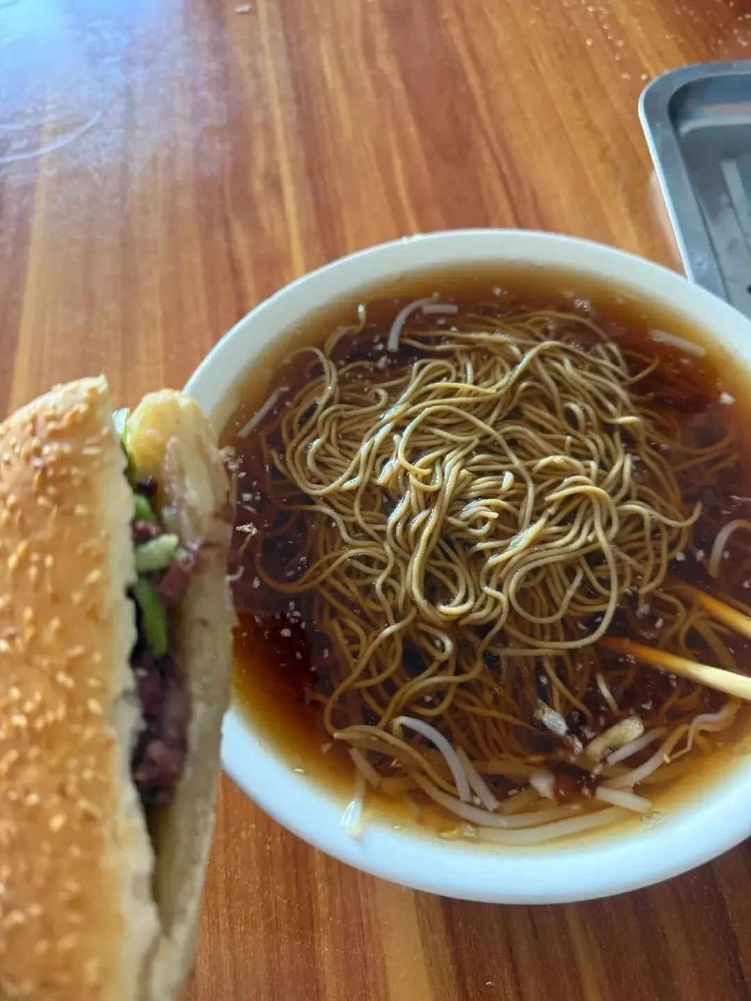 之前去石家庄吃过一回这种凉拌饸饹,还配了这种芝麻烧饼夹肉,那味儿我记到现在都忘不掉。你看这满满一碗,饸饹都浸在料汁里,顶上加一大勺蒜泥,想想都流口水啊。滑溜溜的饸饹拌开,每一根都裹着味儿,凉丝丝鲜爽的,一口下去太开胃了。