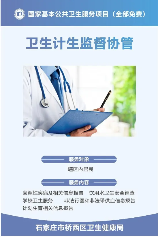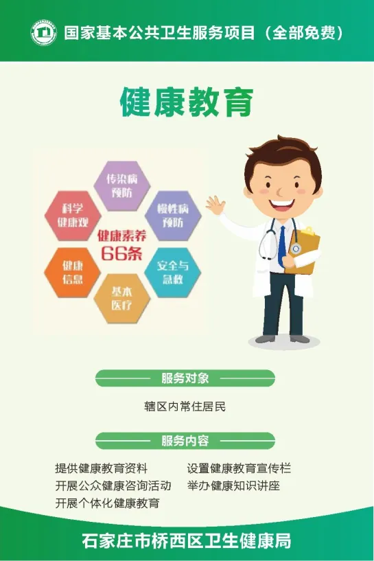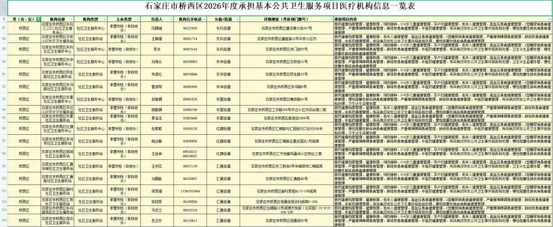 实施国家基本公共卫生服务项目,是我国政府针对当前城乡居民存在的主要健康问题,以儿童、孕产妇、老年人、慢性疾病患者为重点人群,面向全体居民免费提供的最基本的公共卫生服务。项目主要包括建立居民健康档案、老年人健康管理、预防接种、肺结核患者健康管理、慢性病健康管理(高血压、2型糖尿病患者健康管理、慢性阻塞性肺疾病患者健康管理)、健康教育、传染病和突发公共卫生事件报告和处理、严重精神障碍患者管理、0—6岁儿童健康管理、孕产妇健康管理、卫生计生监督协管、中医药健康管理12类。项目自2009年起实施,到目前已经开展17年。开展服务项目所需资金主要由政府承担,城乡居民可直接受益。现将2026年石家庄市承担国家基本公共卫生服务项目机构信息予以公示。