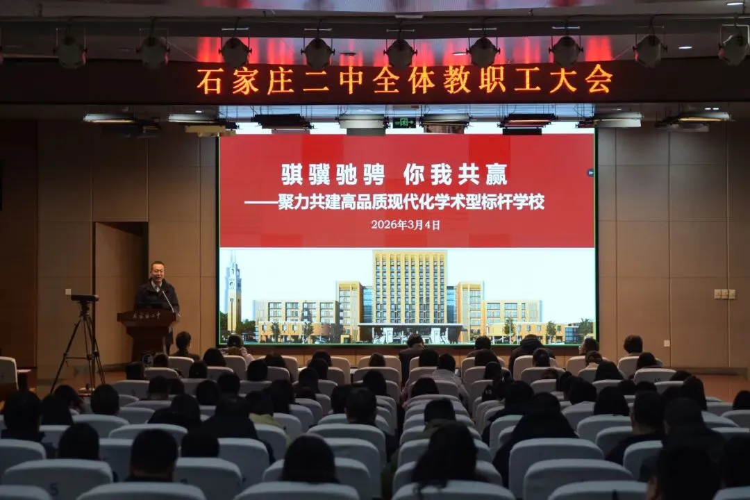 春启新程,奋楫争先。3月4日上午,石家庄二中隆重召开新学期全体教职工大会,会议由校长宋泽亮主持,本部教工现场参会,铭德、启德校区教工同步线上参会,全体二中人以饱满热情、崭新风貌,共迎新学期,共启“高品质现代化学术型标杆学校”建设新征程。