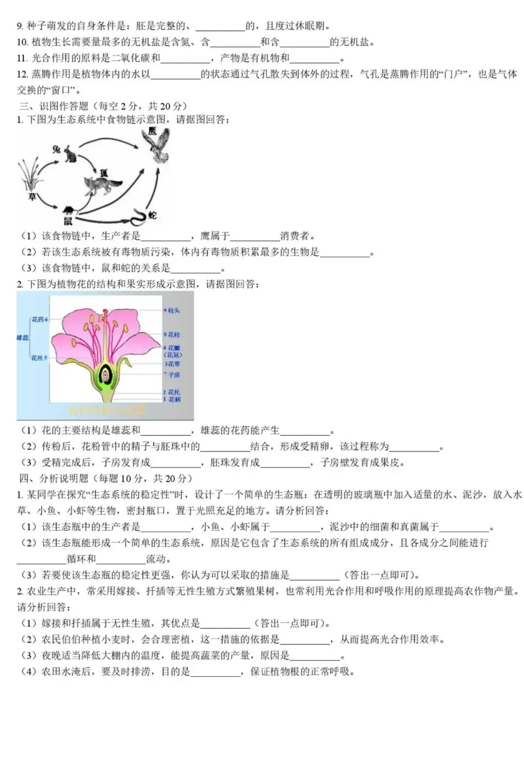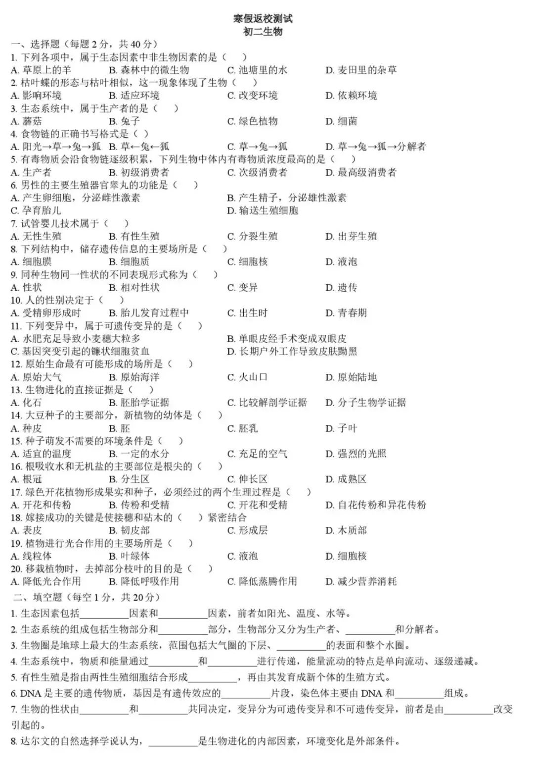 开学测|2026年3月石家庄外国教育集团(43中)寒假返校测试八年级生物(0305,含答案)