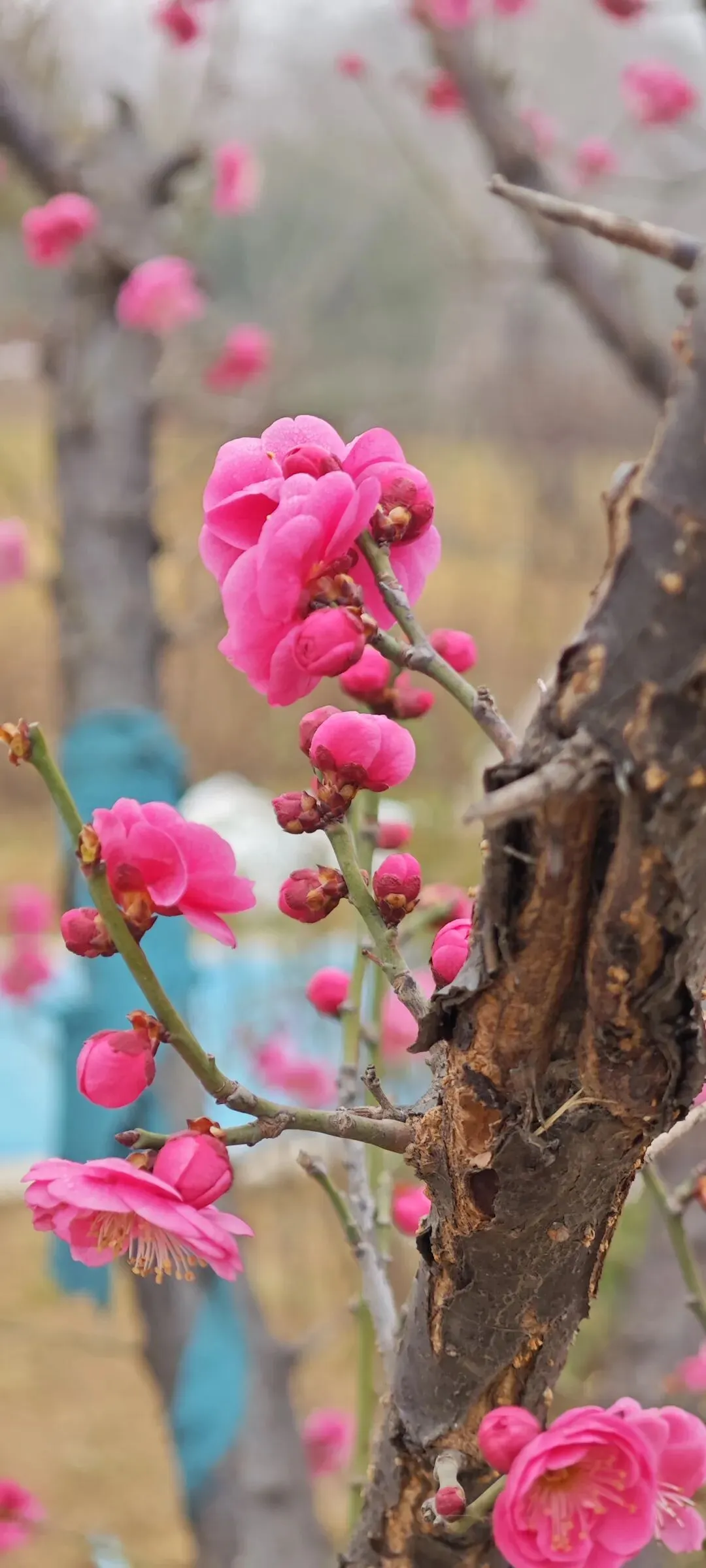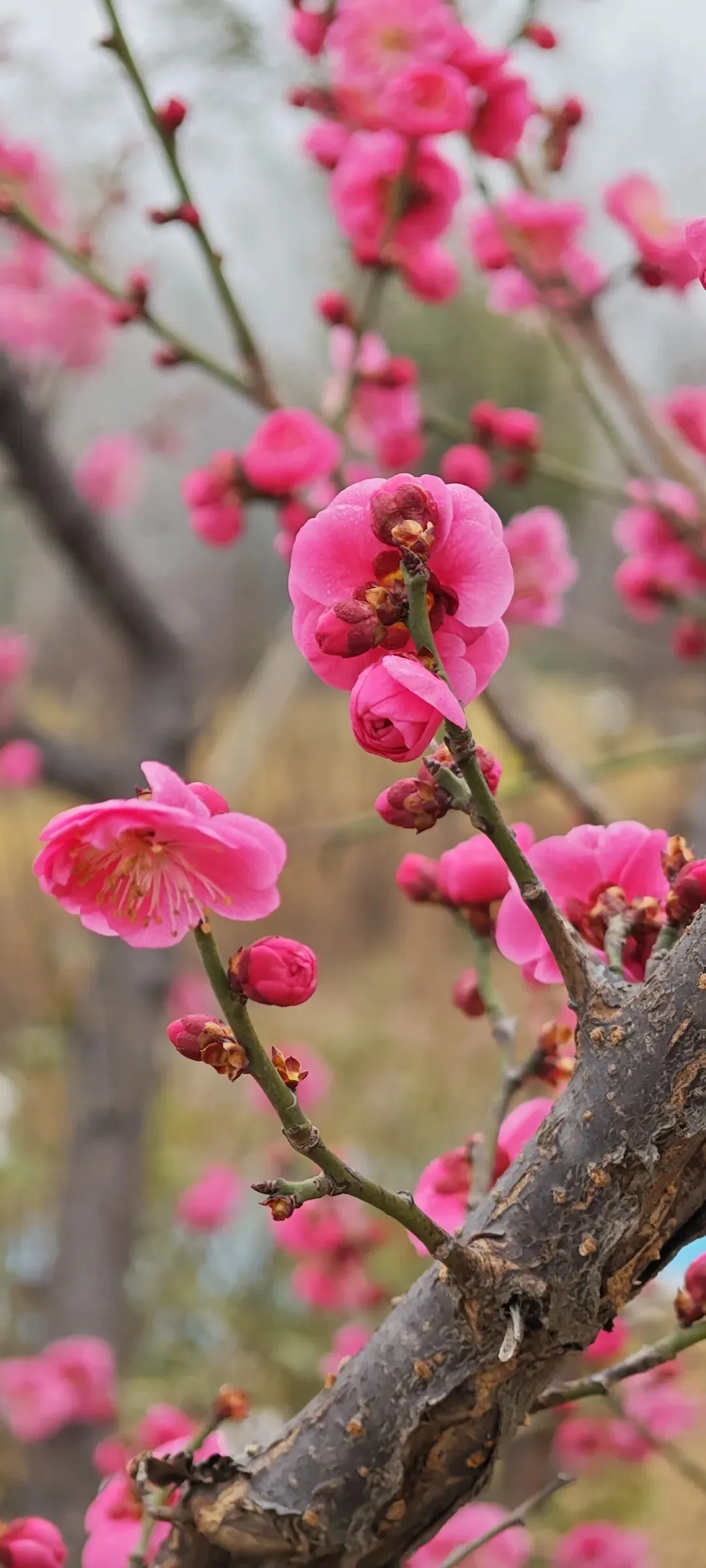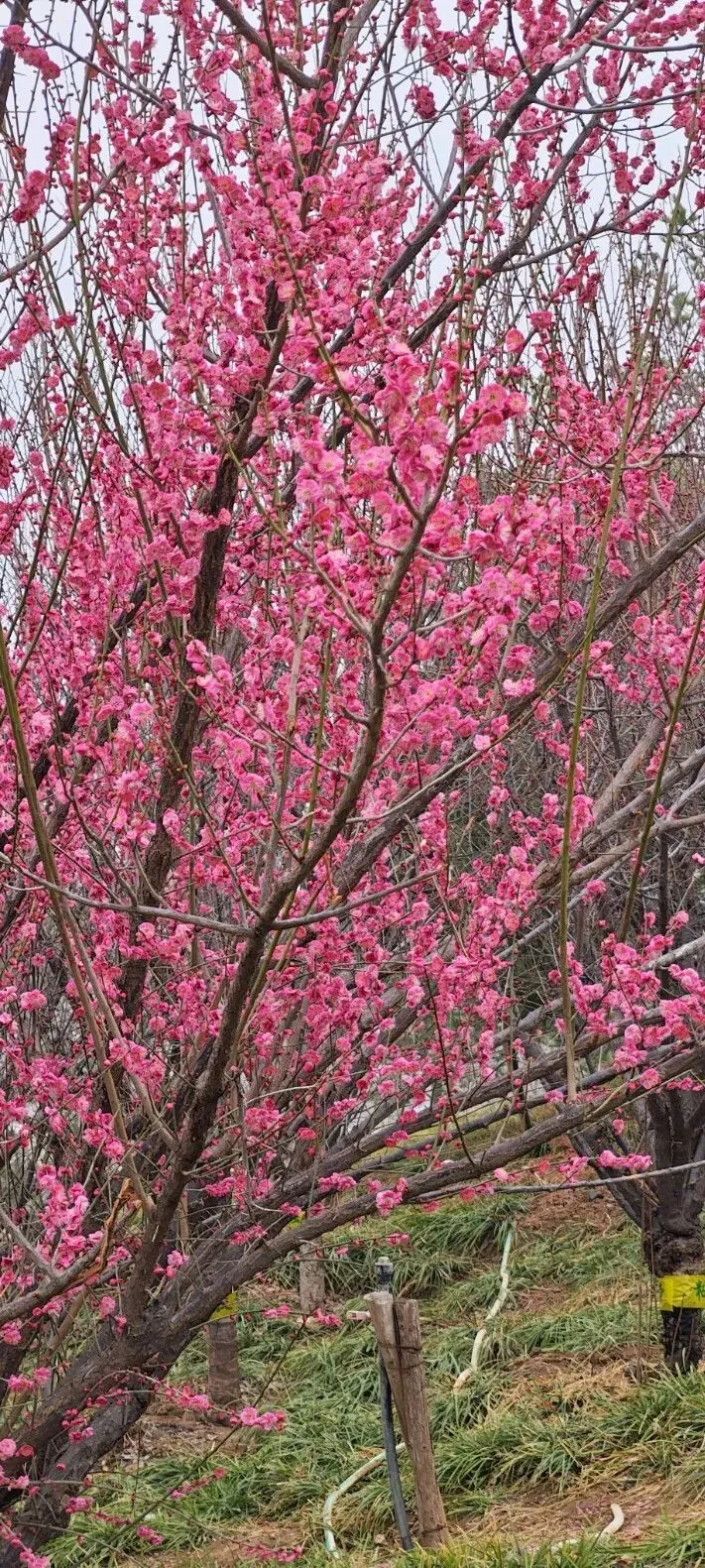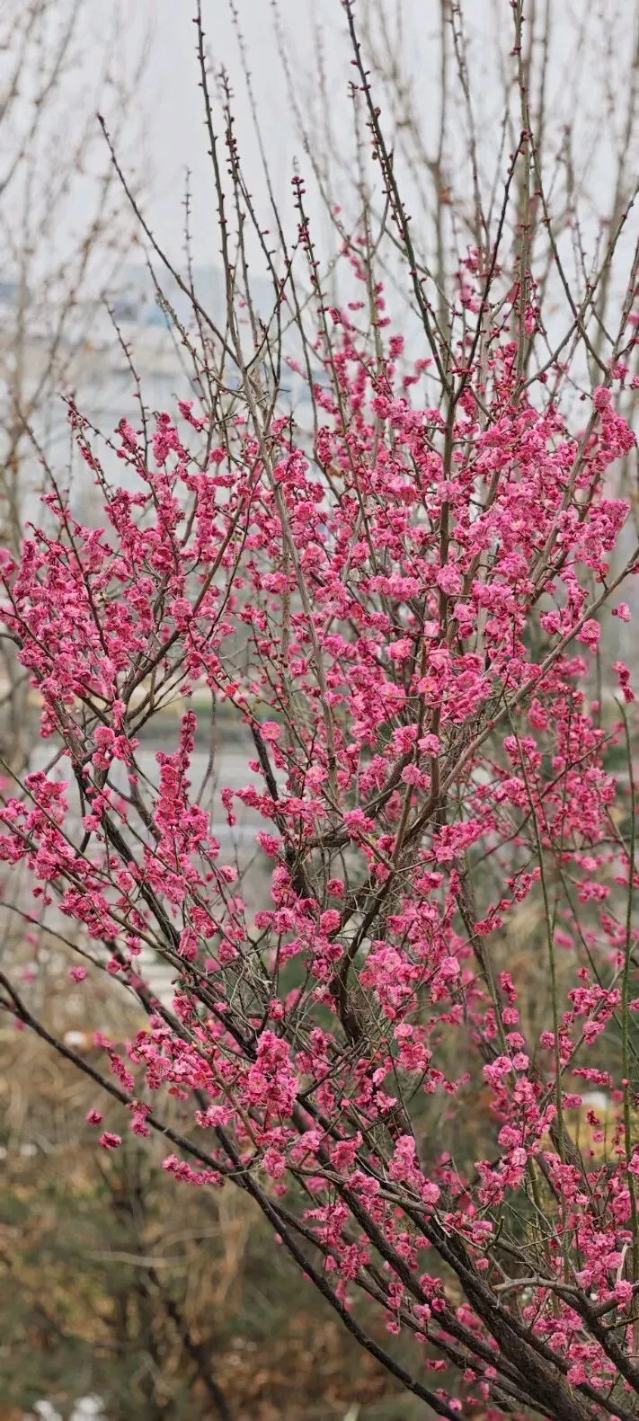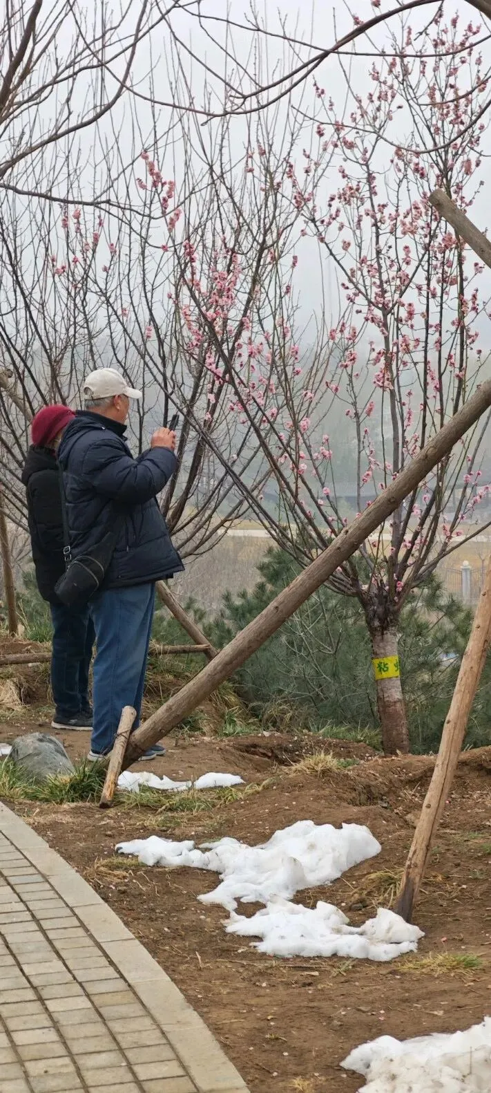 石家庄的公园不少,裕西公园、长安公园、平安公园、东环公园、西环公园……,都是石家庄人日常休闲好去处,跑步、跳舞、唱戏、遛娃、发呆,总有一所公园是你喜欢的。可是,这些公园的名字都很实在、很普通,实在的就像石家庄人性格里的厚道,普通的也像石家庄这个城市的低调不张扬。实在好,普通也不错,但就是缺少点儿浪漫。你看人家别人家的园子,名字里是满满的故事。乾隆元年,钱塘诗人汪沆慕名来到扬州,在饱览了这里的美景后,与杭州西湖作比较,赋诗:“垂杨不断接残芜,雁齿虹桥俨画图。也是销金一锅子,故应唤作瘦西湖。”名字一改,不仅秀美,不仅蹭了杭州西湖的流量,还让人知道扬州是何等的富庶之地,何等的温柔之乡。比如苏州的狮子林,因园内"林有竹万,竹下多怪石,状如狻猊(狮子)者",又因天如禅师惟则得法于浙江天目山狮子岩,为纪念佛徒衣钵、师承关系,取佛经中狮子座之意,故名"师子林"、"狮子林"。亦因佛书上有"狮子吼"一语("狮子吼"是指禅师传授经文),且众多假山酷似狮形而命名。如今好了,梅岭春早,石家庄也有了名字好听又浪漫的公园了。早听说这里遍植梅花,来赏梅的人很多,所以也想去看看。可是,导航一搜索,发现好远呀。不在市区,在正定呢。还好,地铁+公交+步行,还是可以到的。那就行动吧。先坐了地铁一号线,导航说在平安大街出A口,然后坐131路公交车,到柳林铺就到了。然而,事情并没有简单,从A口出来,并不能找到去正定方向的131。站在十字路口彷徨一下,观察一下路上的车辆,发现131是从新百开出的,所以,出A口不是个好办法,应该出B口,那里就有个公交站。果然,走过去发现,对了,去正定方向的131路公交车就在地铁一号线平安大街B口那里,相距不过几米远。看来,导航也有不靠谱的时候啊!出门,大概方向靠导航,有时候还得要人脑参与微调才好啊。坐上公交车,一路看风景,走走停停的过程中我发现其实不用那么早坐公交,因为在柳辛庄那里还有地铁2号线呢。可以在那里坐公交,会更快。在柳林铺下了公交车,继续步行导航,路不太远,也不难走。路边的空地上有不少高高低低的干枯芦苇,微风吹拂,芦苇轻轻晃动,在残雪的映衬下有几分野趣之美。“蒹葭苍苍,白露为霜”,如今不是秋天是初春,没有白露为霜,但有残雪皑皑,也很好看呢。跟着导航,拐几个弯儿就到了。只是路上在修路,临时道路人很少,不时有大车经过,可笑的是导航分不清左右,还是得自己决定,还好那路只能往一个方向走,又问了一个路人,终于到了。说实话,到最后也不知道正门在哪里,我是从一个侧门进去的。不用走进去就看到了土山上盛开的红梅,一树树,玫红的颜色很显眼,很吸引人。入口处有公园平面图的介绍,还看到了蓝色的步道。刚刚下过雪,地上还有点儿湿,怕滑倒,不敢贸然踩着土路上山。沿着蓝色步道走,找到了石头台阶,拾级而上,台阶两旁有娇黄的迎春,但更多的是盛开的红梅花儿。虽然天有点儿阴沉沉的,没有阳光花儿少了几分明媚,但依然是动人心魄的美。不少人为了拍到红梅的细节美,踩着泥泞走到树下,有人用心为花儿拍照,有人摆好姿势跟花儿合影留念。站在山顶往四面张望,可以看到深红、浅红颜色不一的红梅。