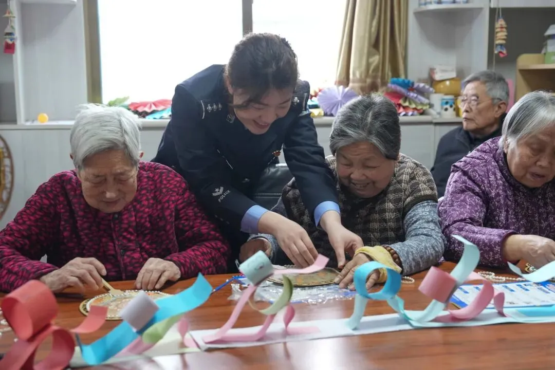 活动现场,青年民警用通俗易懂的语言为老人们讲解电信网络诈骗的常见手段与防范要点,结合典型案例提升老年人防骗意识。讲解结束后,青年女民警陪伴老人共同制作手工团扇,在指尖互动与家常闲谈中传递温暖与关怀,用真情守护“夕阳红”的幸福安宁。