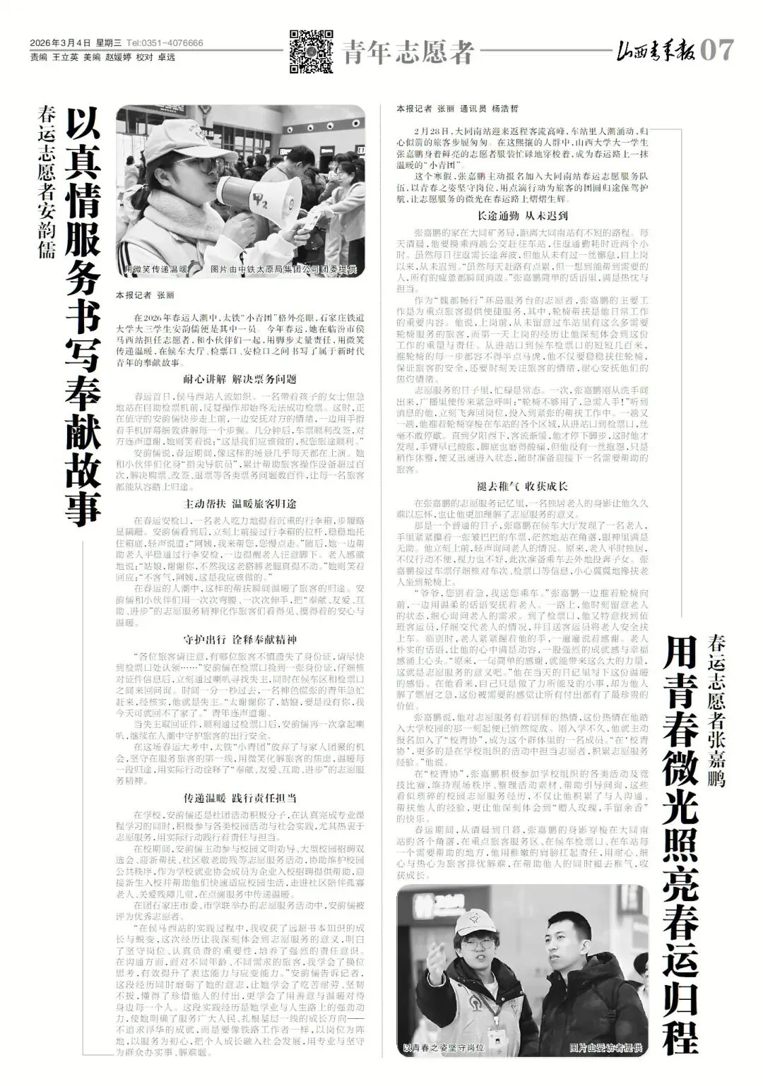 “各位旅客请注意,有哪位旅客不慎遗失了身份证,请尽快到检票口处认领……”安韵儒在检票口捡到一张身份证,仔细核对证件信息后,立刻通过喇叭寻找失主,同时在候车区和检票口之间来回问询。时间一分一秒过去,一名神色慌张的青年急忙赶来,经核实,他就是失主。“太谢谢你了,姑娘,要是没有你,我今天可就回不了家了。”青年连声道谢。当失主取回证件,顺利通过检票口后,安韵儒再一次拿起喇叭,继续在人潮中守护旅客的出行安全。在这场春运大考中,太铁“小青团”放弃了与家人团聚的机会,坚守在服务旅客的第一线,用微笑化解旅客的焦虑,温暖每一段归途,用实际行动诠释了“奉献、友爱、互助、进步”的志愿服务精神。传递温暖 践行责任担当