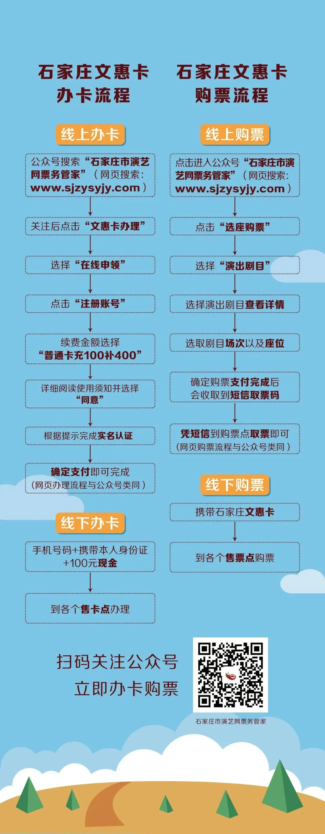 1、“文惠卡”普通卡办理,办卡人需提供本人有效身份证件和电话号码、100元现金,到售票(卡)点现场办理。还可关注“石家庄演艺网票务管家”,或登录石家庄市艺术研究院网站(www.sjzysyjy.com)进行线上申领。