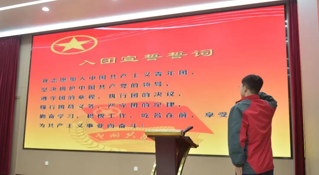 面向鲜红的团旗,全体新团员高举右拳,在领誓人23级唐皓文同学的带领下庄严宣誓,铿锵有力的誓言响彻会场,彰显着青年一代听党话、跟党走的坚定决心。