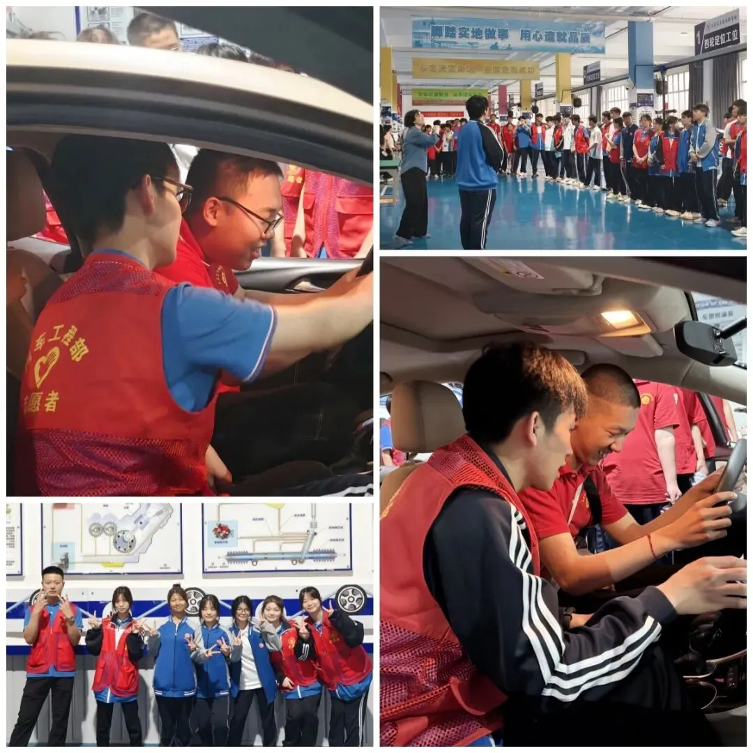 在汽车工程专业部实训基地,志愿者先是讲解了实训楼前雕塑的意义,接着带领同学们参观了汽车实训室,并模拟体验了汽车驾驶,感受汽车的魅力。