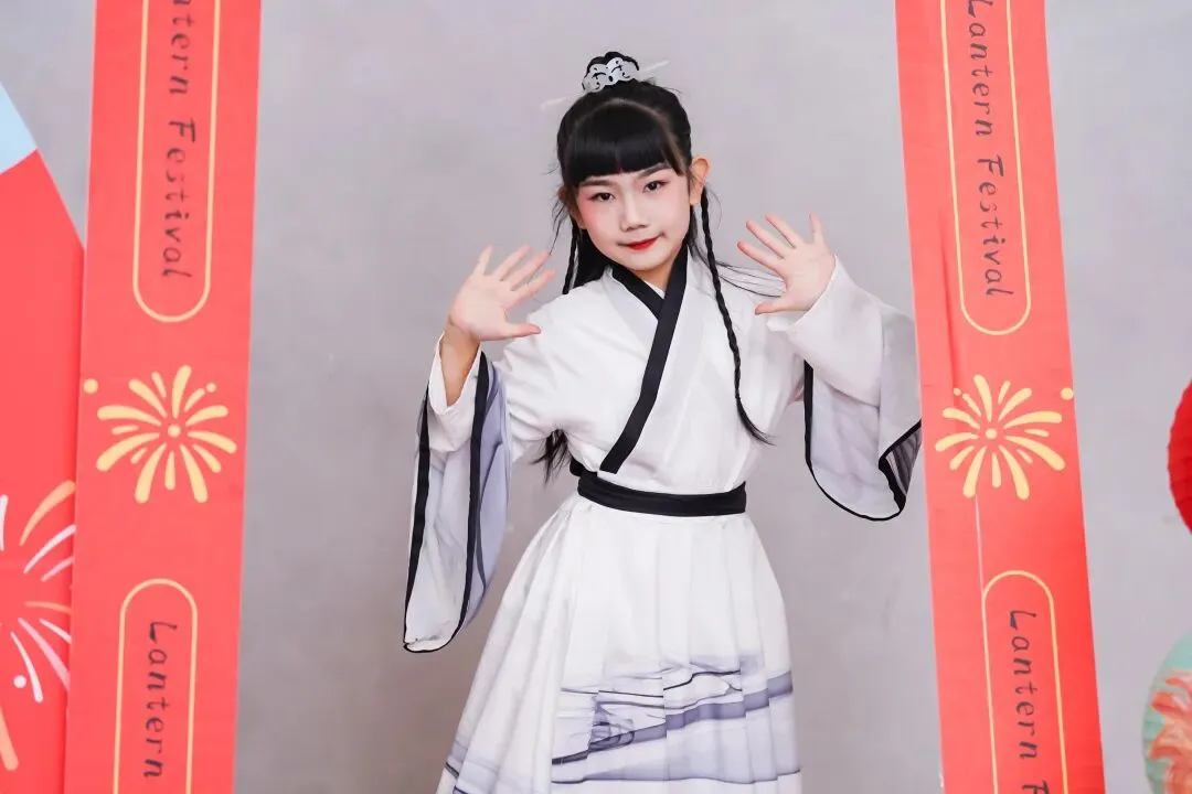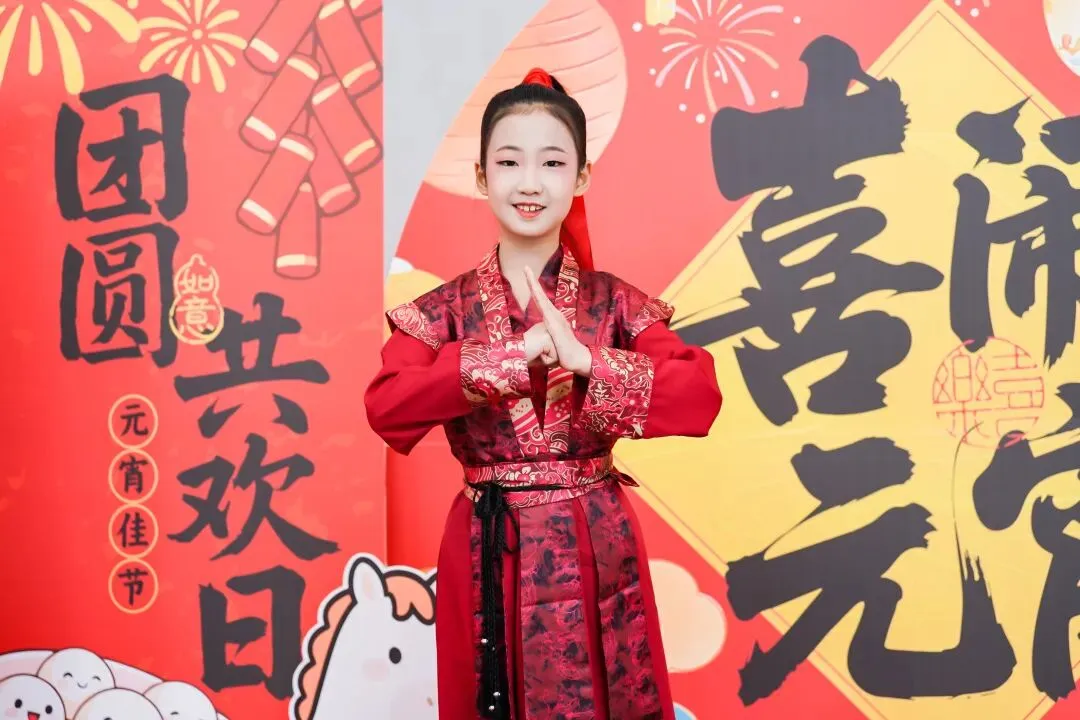活动现场设置了元宵主题拍照打卡区,孩子们在红灯笼、元宵等装饰前拍照留念。