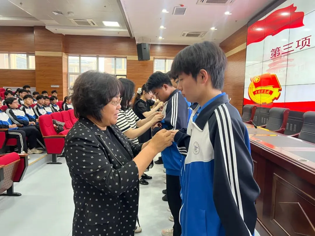 校工会主席张荣新仪式开始,全体师生起立,奏响国歌。接着工会主席张荣新宣读新团员名单,并由学校领导、专业部部长、教师代表为同学们佩戴团徽。在鲜艳的团旗下,23新能源升学2班孟子奥同学带领230名新团员庄严宣誓。新团员们庄严举起右手,面向团旗齐声宣誓:“我志愿加入中国共产主义青年团,坚决拥护中国共产党的领导……”铿锵有力的誓言,表达了新团员们对共青团组织的无限向往和为团组织增光添彩的坚定决心。接着,23大数据班李锦博作为新团员代表发言,他表示能够加入共青团感到无比光荣和自豪,在今后的学习和生活中,将以团员的标准严格要求自己,努力学习,积极进取,用实际行动践行入团誓词,为团旗增辉,为青春添彩。