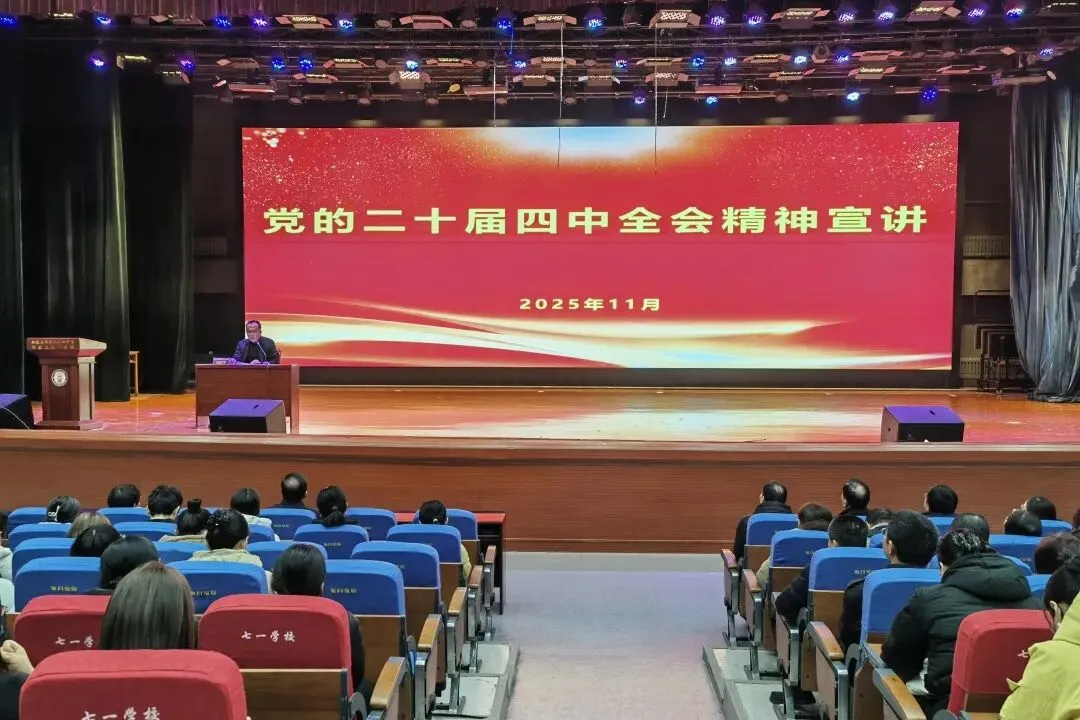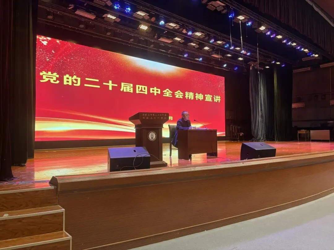 为深入学习领会、全面准确把握党的二十届四中全会精神的重大意义和核心要义,2025年11月28日下午,在石家庄市第二十四中学报告厅,学校党委书记阎保华面向全体教职工宣讲党的二十届四中全会精神。
