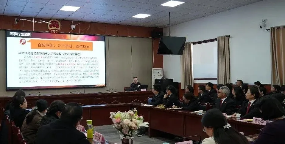 河北省社科院法学研究所副所长蔡欣欣、中院民二庭副庭长靳建军现场进行深度点评,立足学术前沿、紧扣办案实操,为与会干警带来一场高质量的思想盛宴,赢得阵阵掌声。在交流互动环节,大家气氛热烈、踊跃发言,围绕审判实务中的问题深入探讨、坦诚交流。灵寿法院在家班子成员、全体员额法官、法官助理参加活动。
