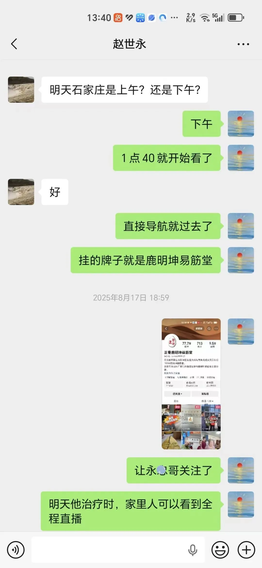 公元2025年8月16日,秦总继续陪同亲人,我们一行六人,于下午14点45分,准时奔赴《鹿明坤益筋堂》石家庄总部。推开门,只见鹿大夫在给一位大姨看肩,大厅内,全国各地慕名而来的患者井然有序。我们依然是挂了号,排了队,等待中……