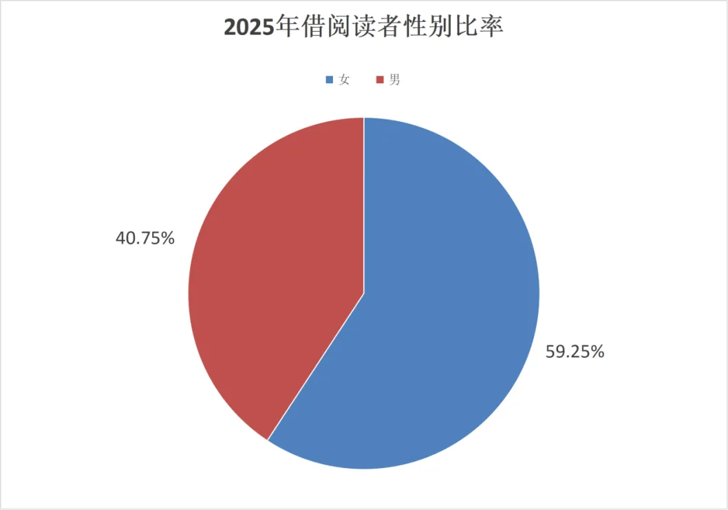 从借阅人次的性别比例分布看,女性读者多于男性读者。其中,女性读者借阅人次占59.25%;男性读者借阅人次占40.75%。