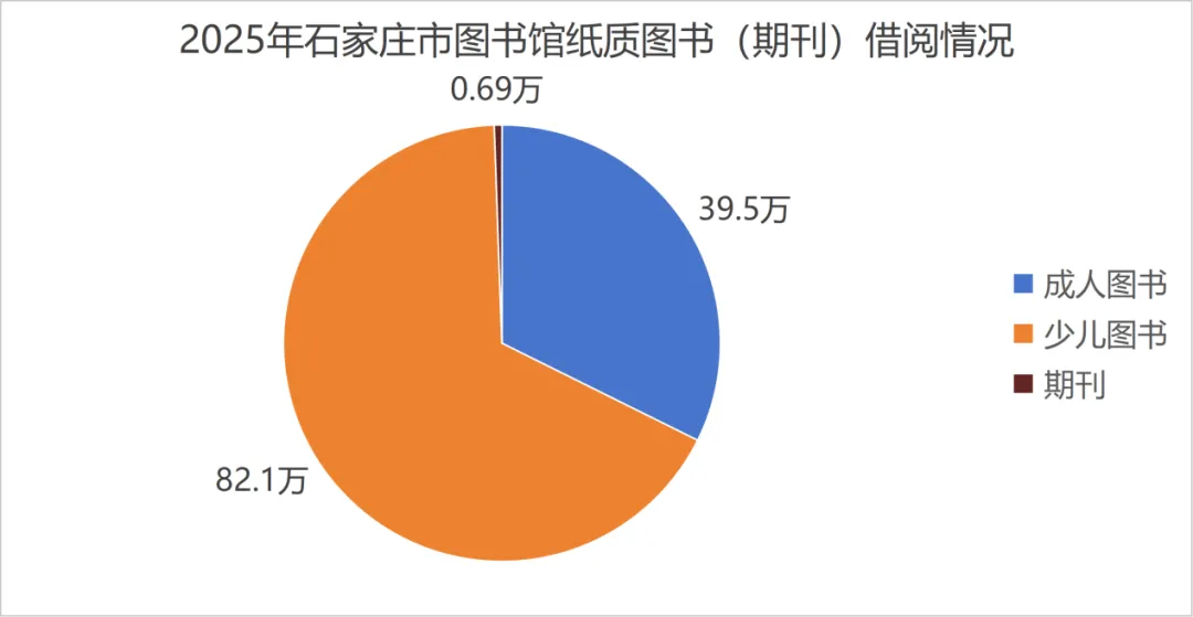 2025年石家庄市图书馆成人图书借阅册次为39.5万,少儿图书借阅册次为82.1万,报刊借阅量为0.69万。