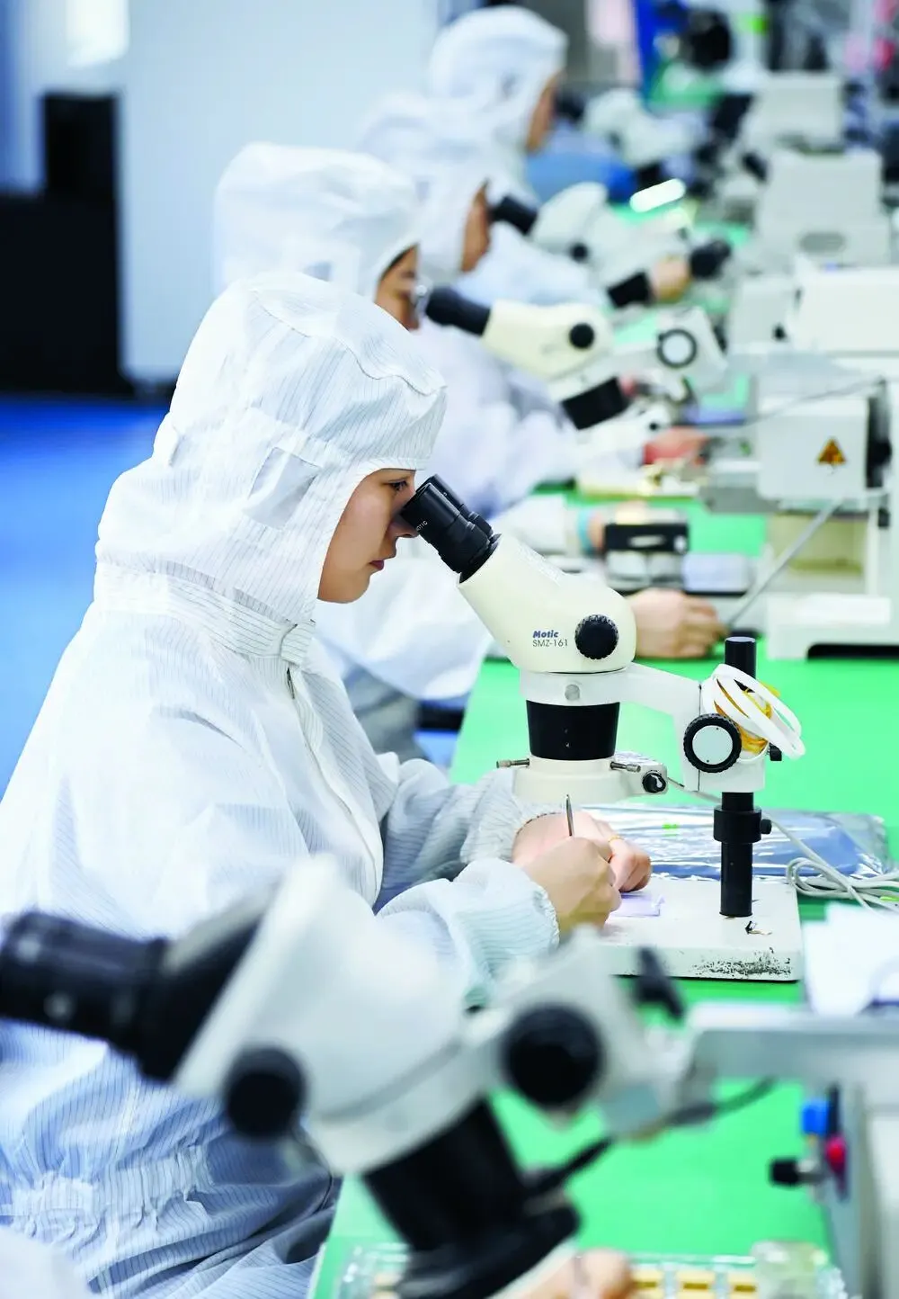 在河北东森电子科技有限公司微组装车间,工作人员正在对功率模块进行MCM微封装生产。