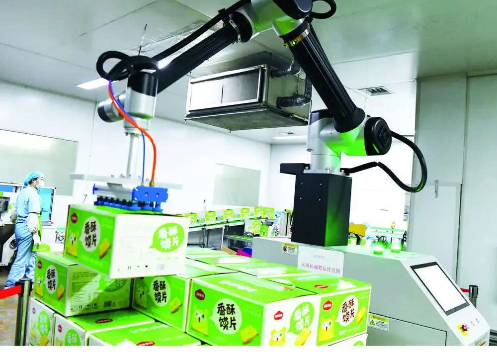 在石家庄市栾城区马家麦坊食品有限公司外包装车间,机器人在进行膜片食品的生产作业。