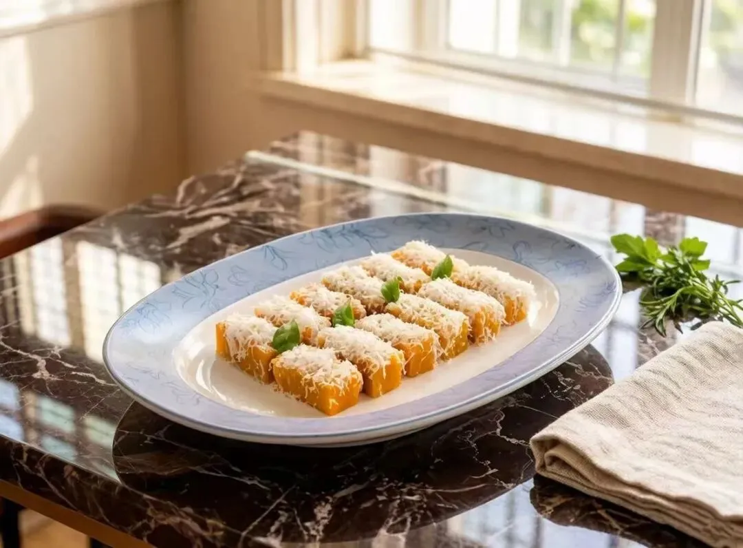 3. 冷藏与改刀:将冷却后的蛋豆腐坯连同容器一起放入冷藏冰箱,静置30分钟使其质地紧实。取出后倒扣脱模,切成5厘米长、2.5厘米宽、1.5厘米厚的均匀长方块。