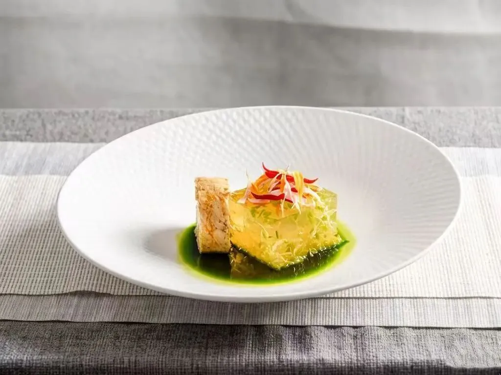 5. 组合上桌:将炸好的豆腐块整齐码放入盘中。将高级清汤、橄榄油、蜂蜜在小味碟中调匀,随豆腐一同上桌即可。