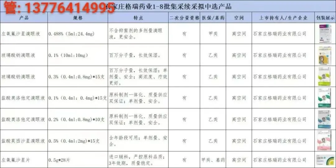 >石家庄格瑞药业1-8批集采续采拟中选产品
