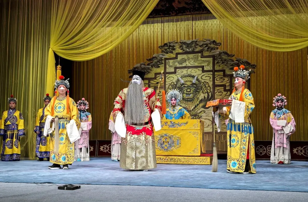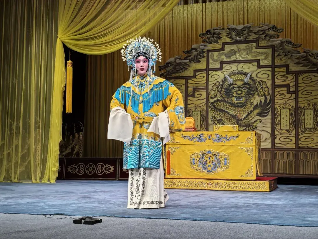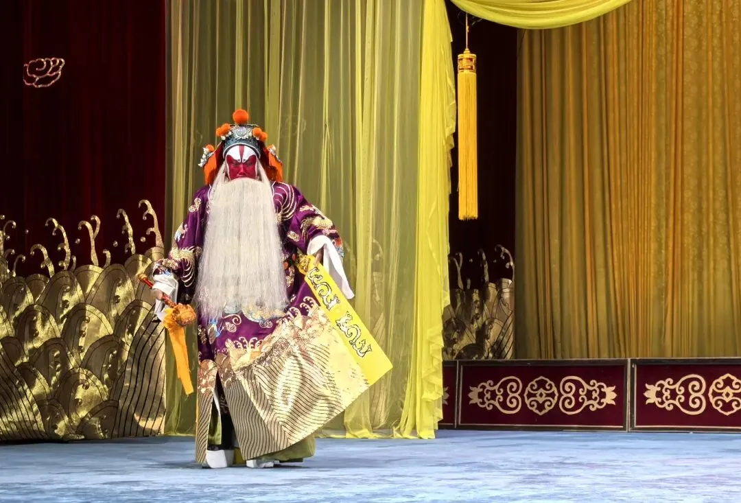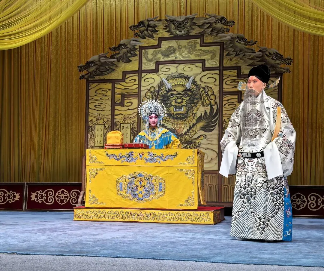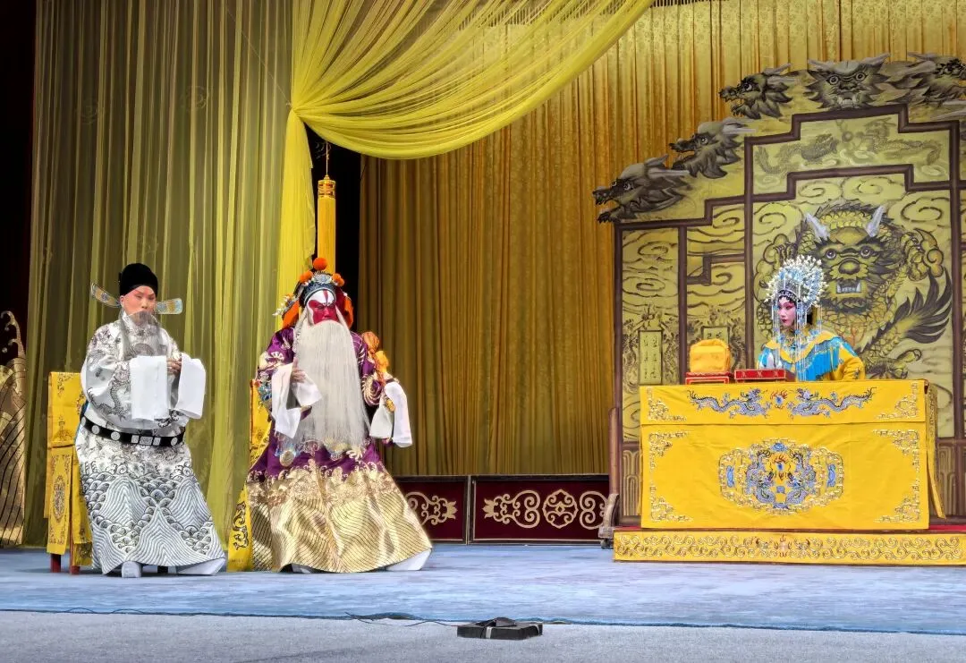 那场戏是京剧传统剧目:《大保国.探皇陵.二进宫》,简称《大探二》,由《大保国》、《探皇陵》、《二进宫》三折组成,讲述了明朝忠臣徐延昭、杨波与奸臣李良的宫廷斗争。该剧以生、旦、净三大行当的精彩唱腔著称,尤其《二进宫》中"跪宫"一段三人对唱被誉为京剧唱功戏巅峰。
