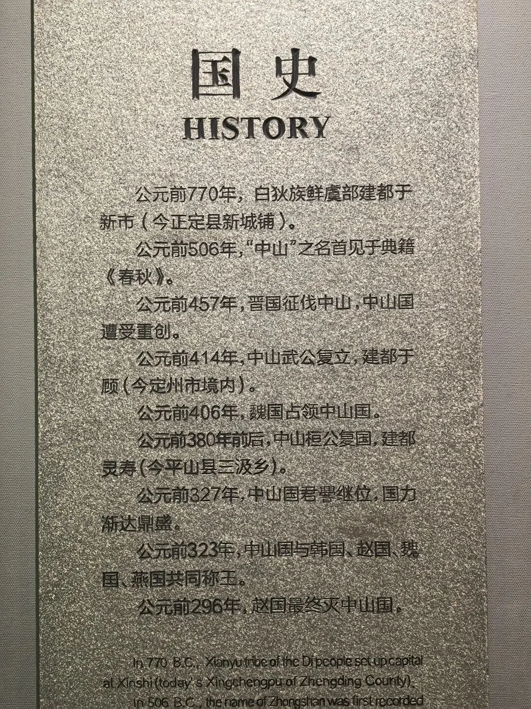 1977年,中山王cuo墓出土了三件刻有长篇铭文的青铜器,记录了中山国的重要史实,确认了中山国都和王室世系。