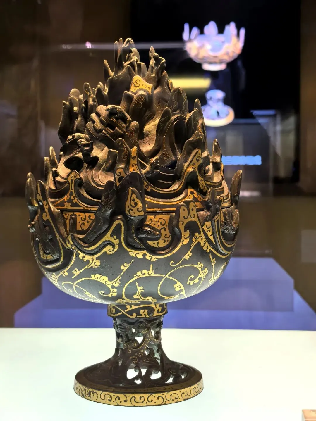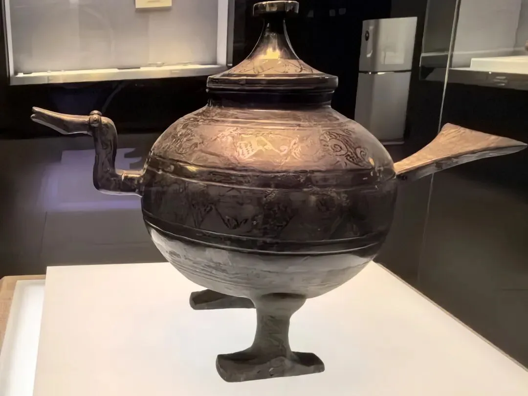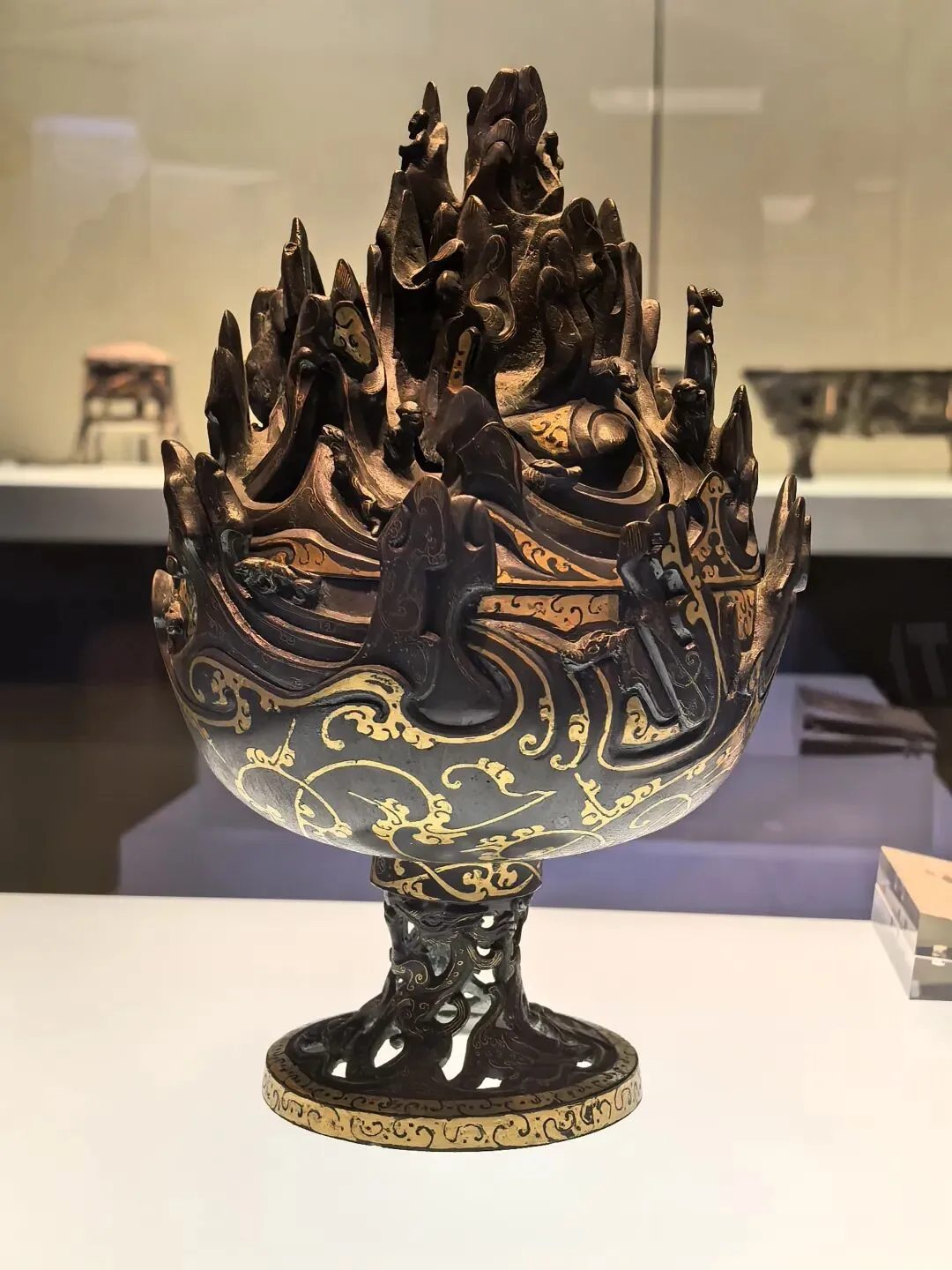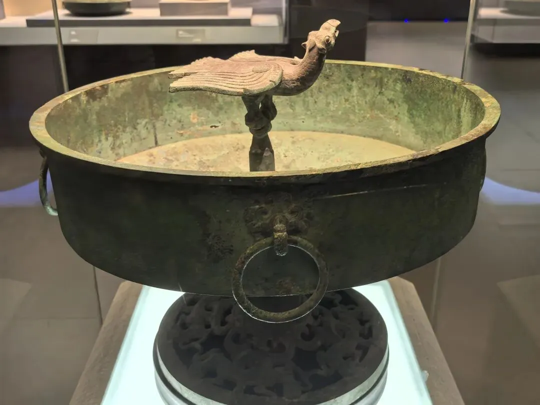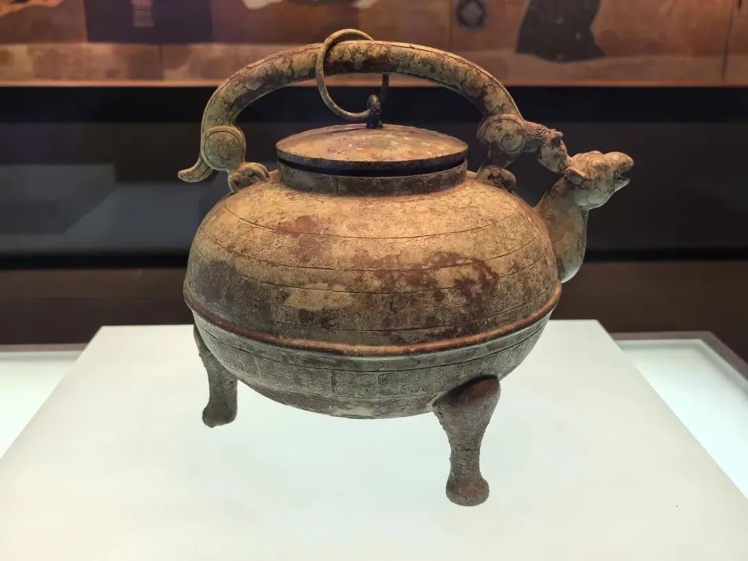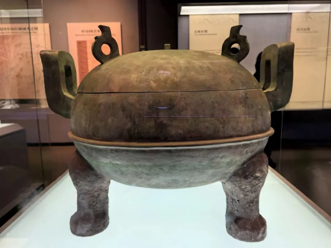礼器、酒器。壶的四角各有一只矫龙,四壁刻有铭文450字,记载王cuo十四年中山伐燕胜利后用燕国的铜器熔铸此壶,颂扬中山国伐燕的战绩,阐述巩固政权的重要性,其中特别提到了中山国君世系,填补了史书空白。中山王cuo铁足铜鼎(复制品) 中山王cuo墓出土 礼器、食器是中山王cuo墓出土九鼎中的首鼎。鼎为铜身铁足,外壁刻有铭文77行469字,是目前发现的铭文最长的战国青铜器。铭文记载了中山国相邦司马赒(zhou)率师伐燕、开疆扩土的功绩,告诫后代要吸取燕国之乱的历史教训,并警惕周边诸国的进攻。 礼器、酒器。出土时壶内盛满了清水。圈足上有铭文23字,记录了制作工匠和壶的重量;壶腹上刻有中山国君ci对父亲的悼词182字,提供了有关王盗和相邦司马赒的资料,具有重要的史料价值。 通体饰勾连云纹图案,镶嵌红铜丝、绿松石并填蓝漆,工艺繁复。壶上刻有铭文:"十四祀,分器,啬夫毫更,所勒省器作勒者。" 盛酒器具。兽口为流,双眼嵌绿松石,器身错银及红铜,并嵌绿松石,盖钮为曲颈的天鹅。