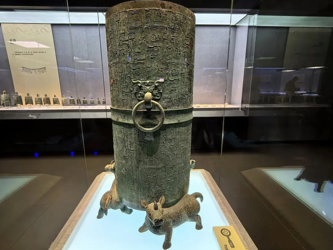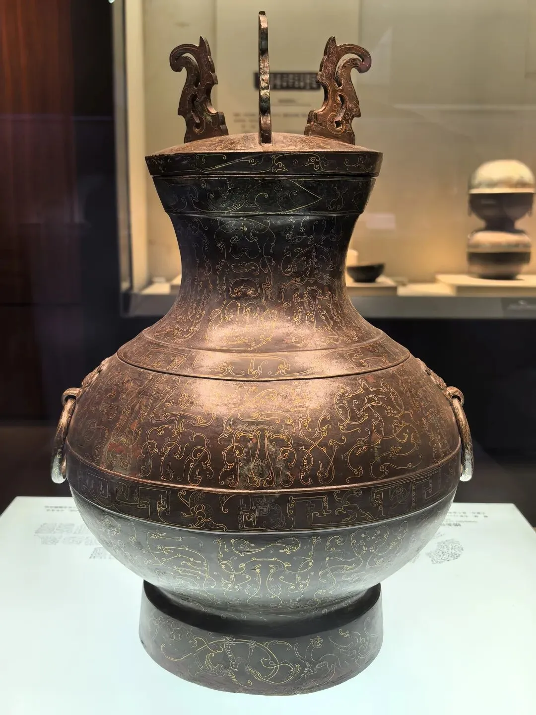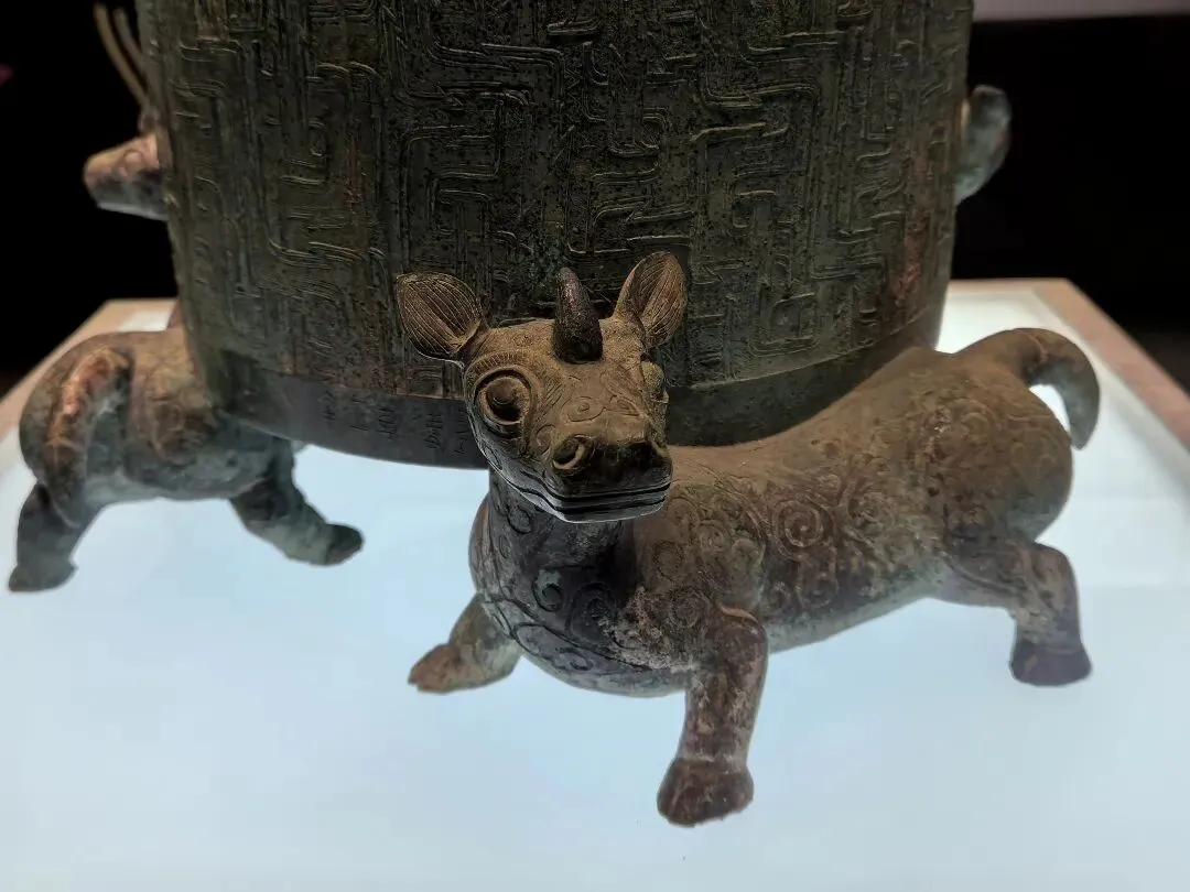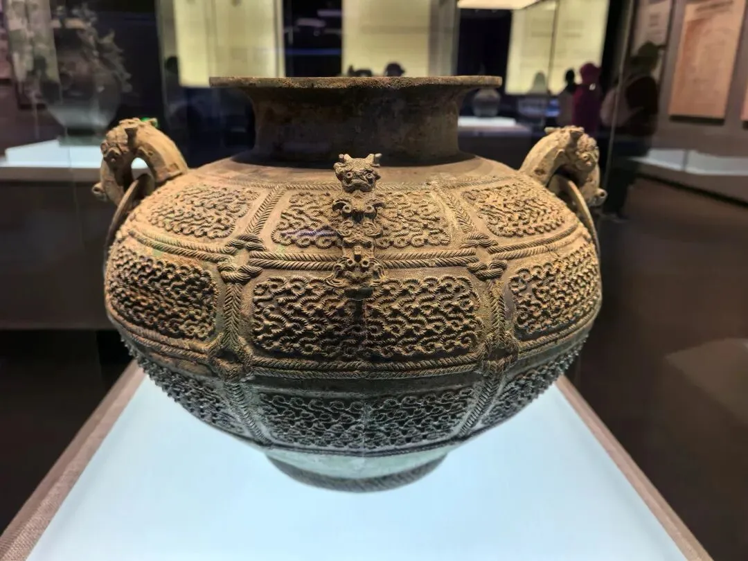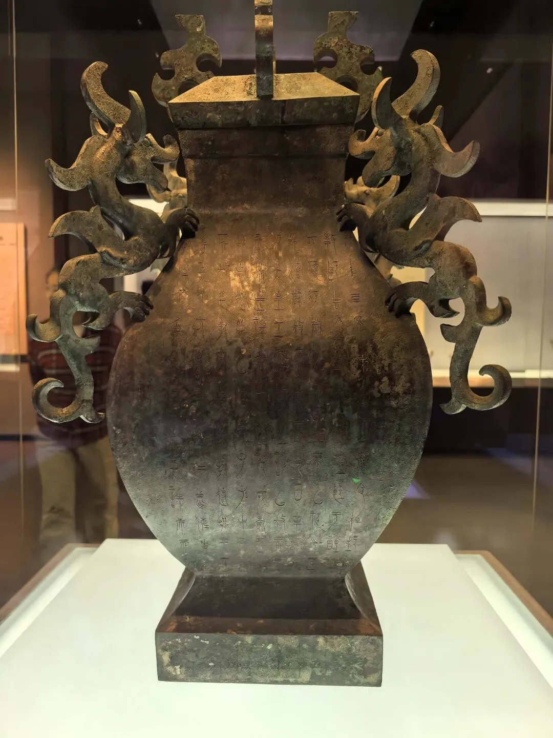 礼器、酒器。壶的四角各有一只矫龙,四壁刻有铭文450字,记载王cuo十四年中山伐燕胜利后用燕国的铜器熔铸此壶,颂扬中山国伐燕的战绩,阐述巩固政权的重要性,其中特别提到了中山国君世系,填补了史书空白。中山王cuo铁足铜鼎(复制品) 中山王cuo墓出土 礼器、食器是中山王cuo墓出土九鼎中的首鼎。鼎为铜身铁足,外壁刻有铭文77行469字,是目前发现的铭文最长的战国青铜器。铭文记载了中山国相邦司马赒(zhou)率师伐燕、开疆扩土的功绩,告诫后代要吸取燕国之乱的历史教训,并警惕周边诸国的进攻。 礼器、酒器。出土时壶内盛满了清水。圈足上有铭文23字,记录了制作工匠和壶的重量;壶腹上刻有中山国君ci对父亲的悼词182字,提供了有关王盗和相邦司马赒的资料,具有重要的史料价值。 通体饰勾连云纹图案,镶嵌红铜丝、绿松石并填蓝漆,工艺繁复。壶上刻有铭文:"十四祀,分器,啬夫毫更,所勒省器作勒者。" 盛酒器具。兽口为流,双眼嵌绿松石,器身错银及红铜,并嵌绿松石,盖钮为曲颈的天鹅。