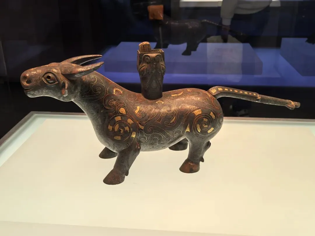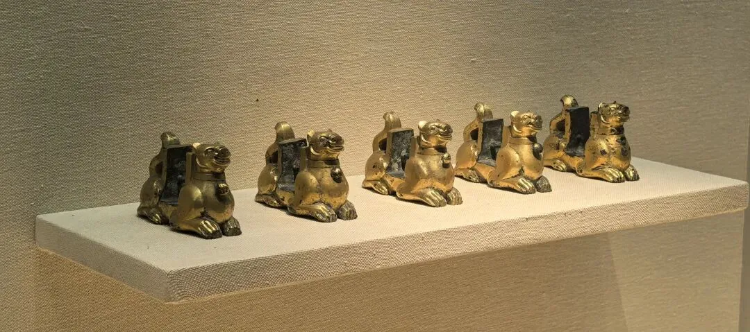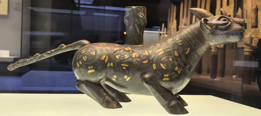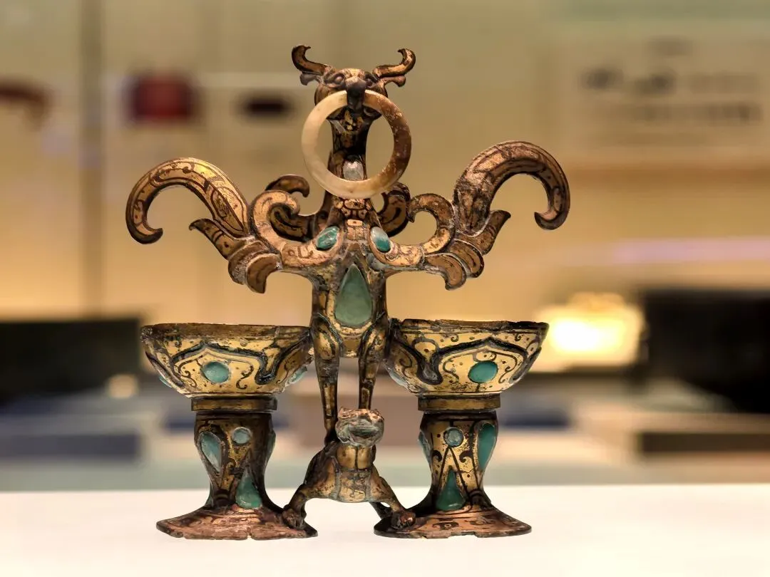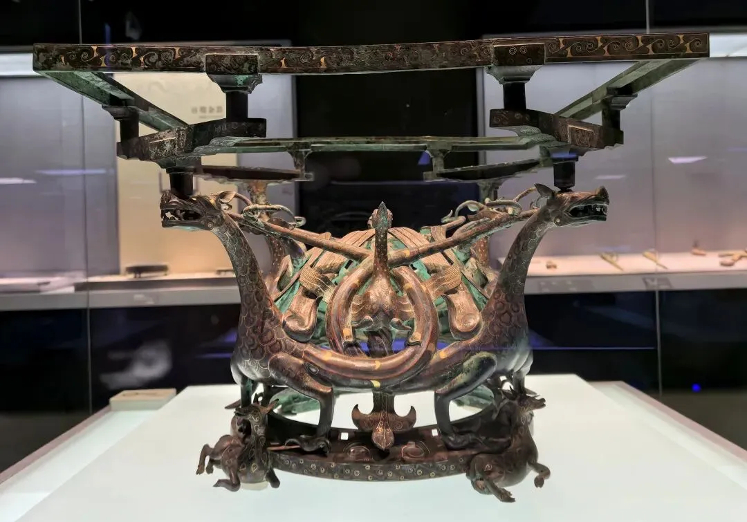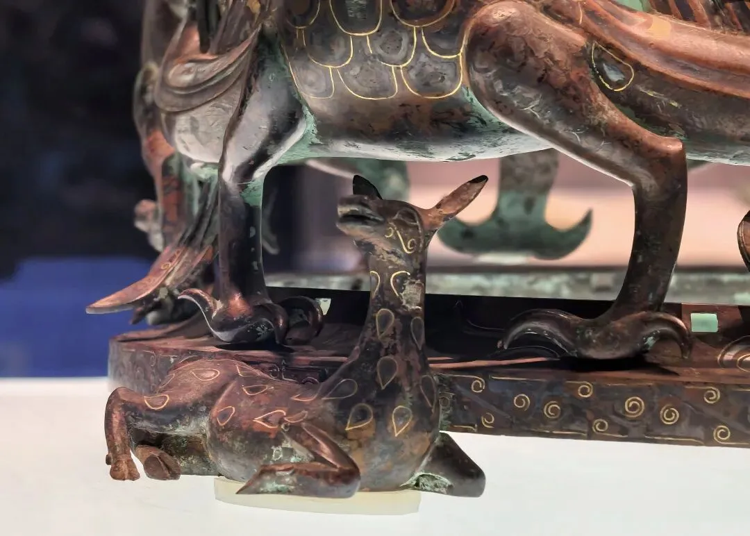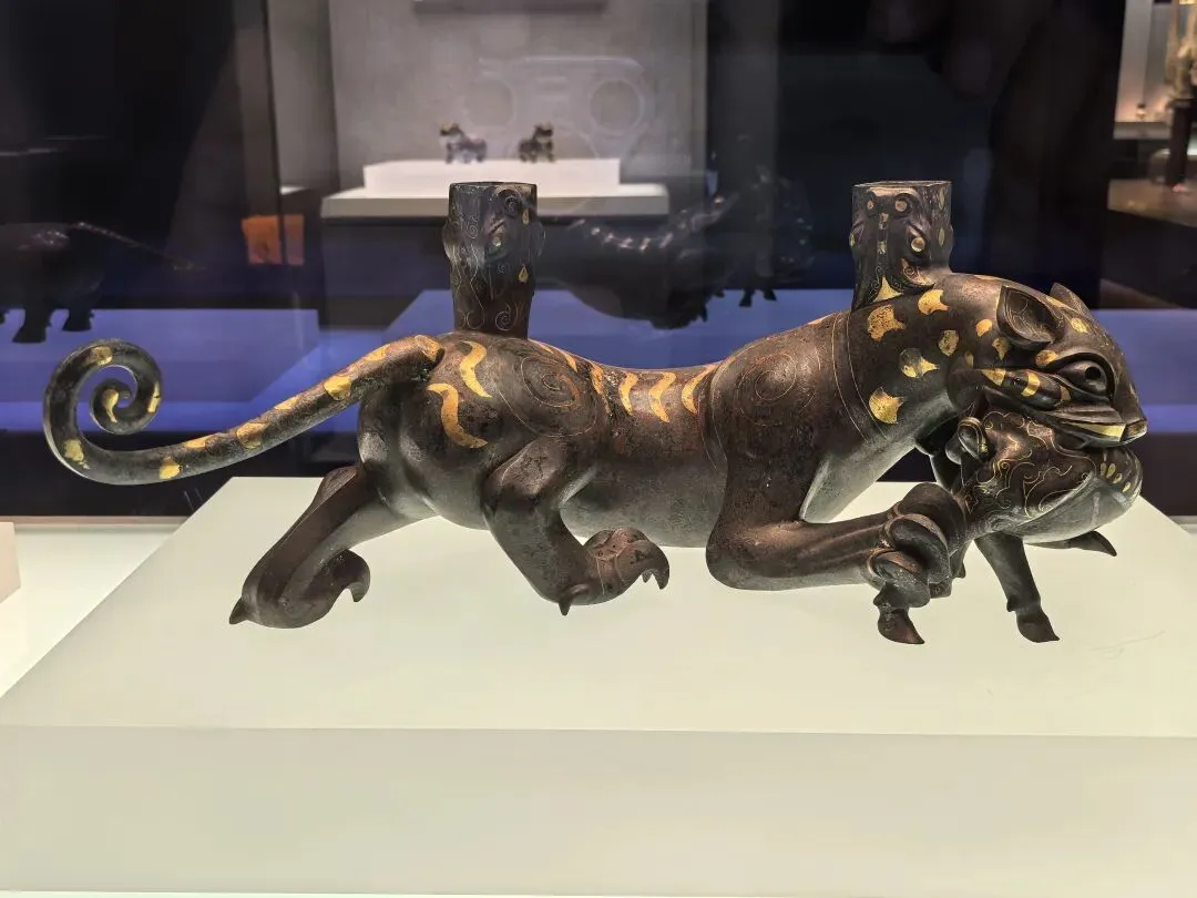 水器或陈设品。盆底一龟背负圆柱,柱顶站立一只可转动的雄鹰,鹰爪抓住两只纠结的蛇头。外壁装饰四只口衔圆环的飞鹰,底座镂雕活泼的螭(chi)纹。上刻铭文:"八祀,冶匀(钧)啬夫孙芯,工酉。"错金银四龙四凤铜方案座(镇馆之宝) 中山王cuo墓出土古代小桌,案面已朽。两雄两雌梅花鹿承托圆形底盘,底盘上四条双翼双尾的神龙昂首挺立,龙的双尾向两侧环绕,反勾住头上的双角,双翼聚于中央连成半球形,龙尾连接四只展翅的凤鸟;龙头承托一斗二升式斗栱,斗栱上托案框。龙飞凤舞,姿态优美,错金银纹饰精巧繁密。 铜牛浑圆壮硕,尾巴挺直,周身饰有错金银卷云纹,尾部错有鳞片纹和长毛纹,爽快明丽。牛背上有山羊头面装饰的銎(qiong)口,用以插放屏风扇,出土时銎内残存木榫(sun)。 连接两扇屏风的插座,造型为猛虎噬鹿。猛虎身躯矫健,正贪婪地将一只小鹿吞入口中;小鹿在虎口中无力地挣扎,状貌凄然。通体饰错金银花纹,虎的颈部和臀部有两个饰山羊面的长方形銎(qiong)口,用于插放屏风扇。
