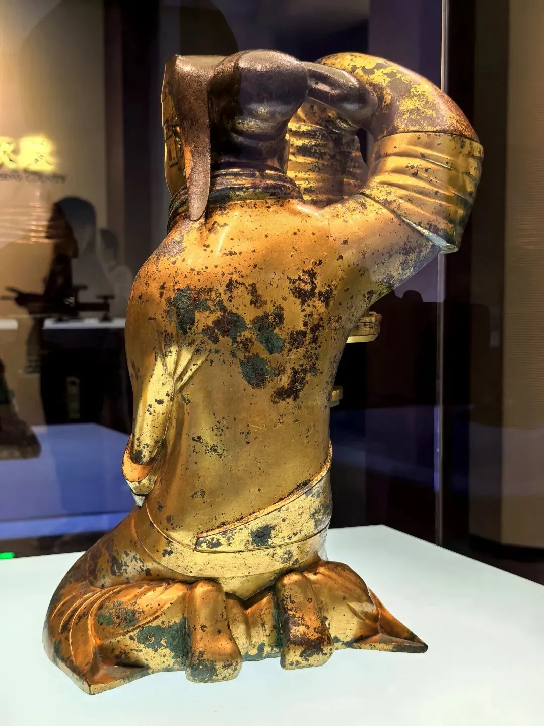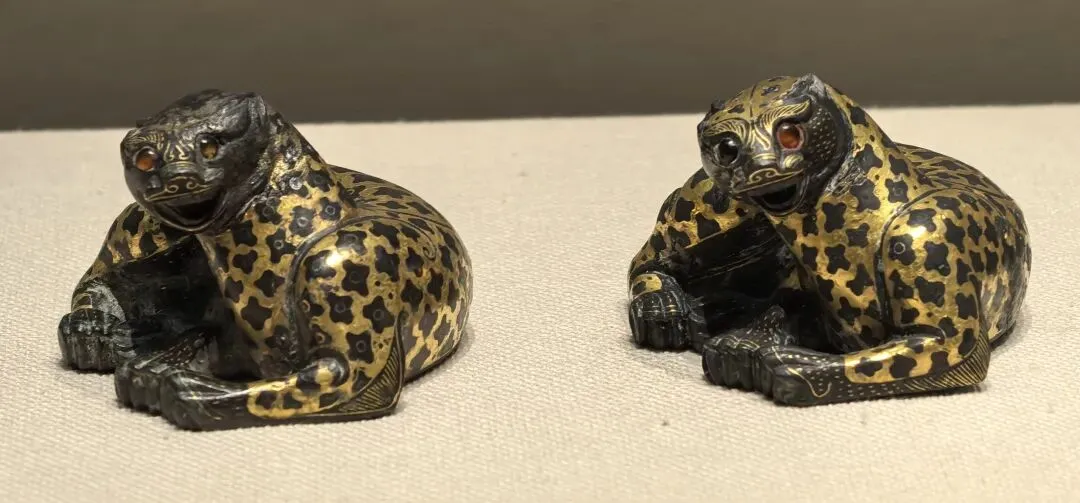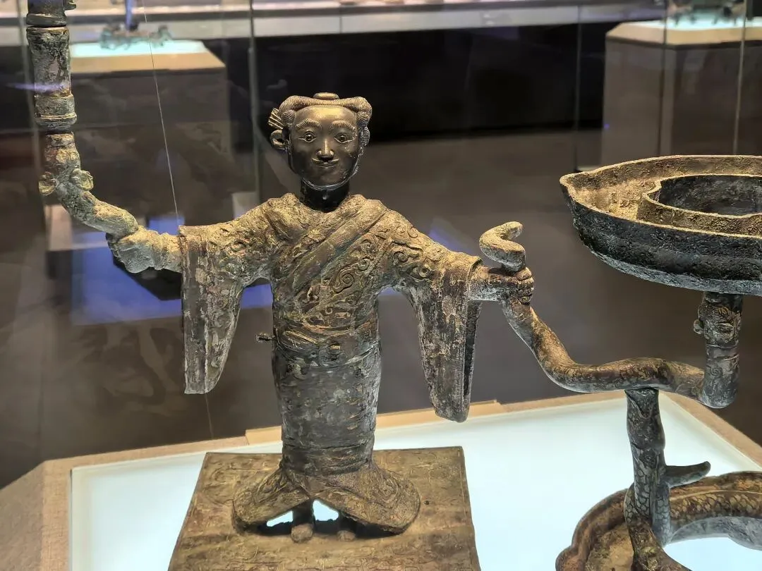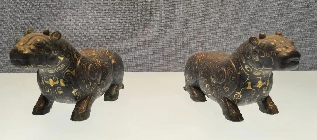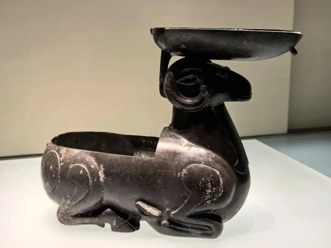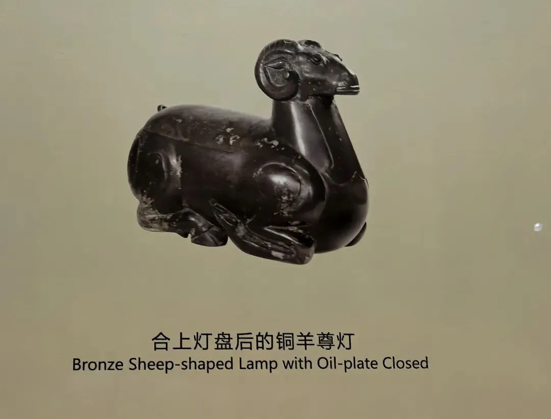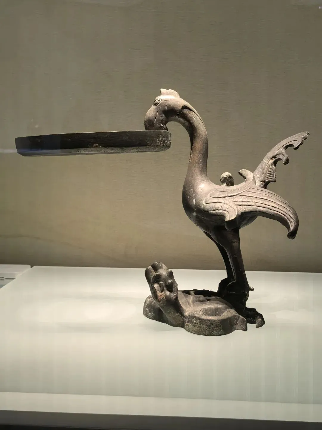 水器或陈设品。盆底一龟背负圆柱,柱顶站立一只可转动的雄鹰,鹰爪抓住两只纠结的蛇头。外壁装饰四只口衔圆环的飞鹰,底座镂雕活泼的螭(chi)纹。上刻铭文:"八祀,冶匀(钧)啬夫孙芯,工酉。"错金银四龙四凤铜方案座(镇馆之宝) 中山王cuo墓出土古代小桌,案面已朽。两雄两雌梅花鹿承托圆形底盘,底盘上四条双翼双尾的神龙昂首挺立,龙的双尾向两侧环绕,反勾住头上的双角,双翼聚于中央连成半球形,龙尾连接四只展翅的凤鸟;龙头承托一斗二升式斗栱,斗栱上托案框。龙飞凤舞,姿态优美,错金银纹饰精巧繁密。 铜牛浑圆壮硕,尾巴挺直,周身饰有错金银卷云纹,尾部错有鳞片纹和长毛纹,爽快明丽。牛背上有山羊头面装饰的銎(qiong)口,用以插放屏风扇,出土时銎内残存木榫(sun)。 连接两扇屏风的插座,造型为猛虎噬鹿。猛虎身躯矫健,正贪婪地将一只小鹿吞入口中;小鹿在虎口中无力地挣扎,状貌凄然。通体饰错金银花纹,虎的颈部和臀部有两个饰山羊面的长方形銎(qiong)口,用于插放屏风扇。