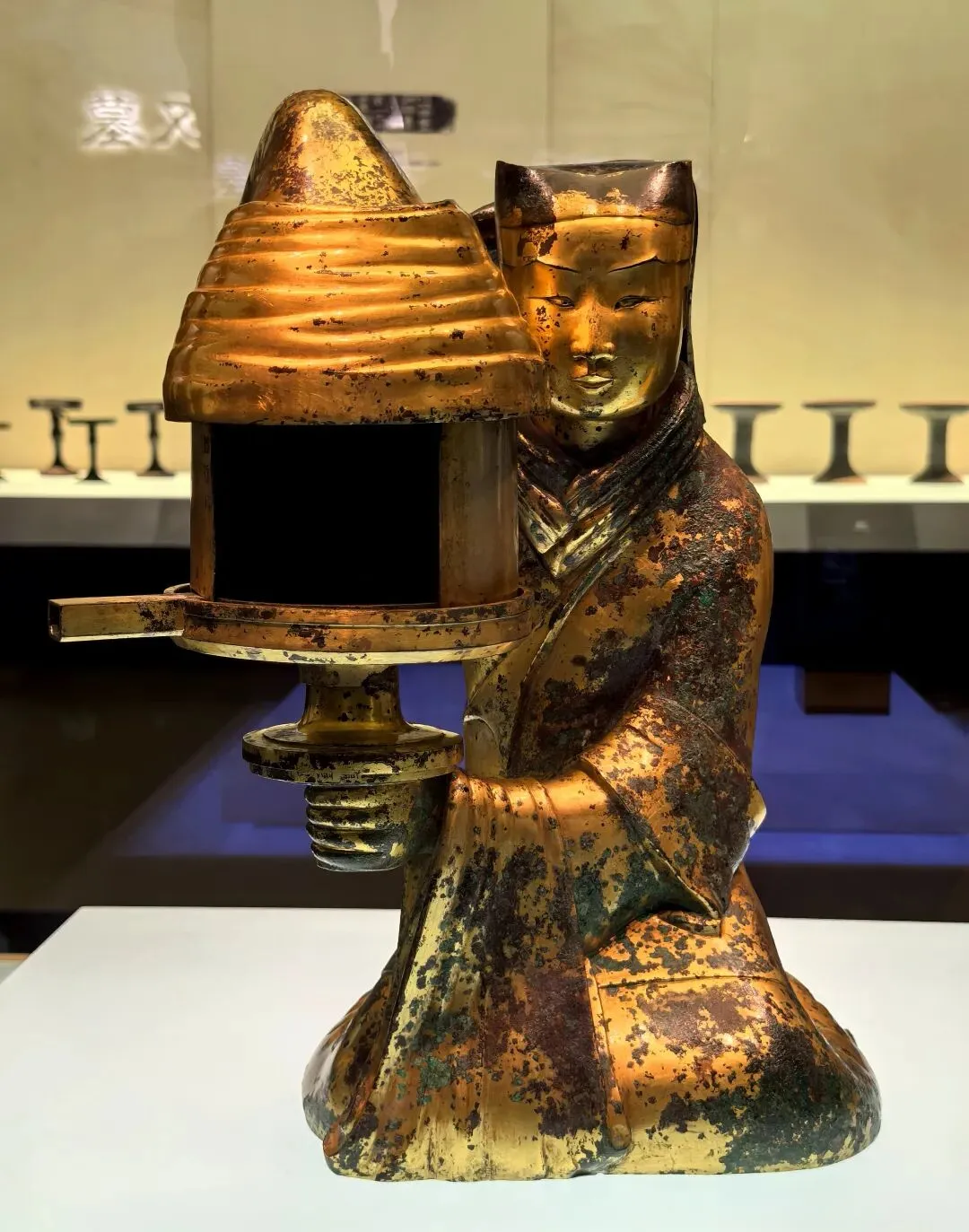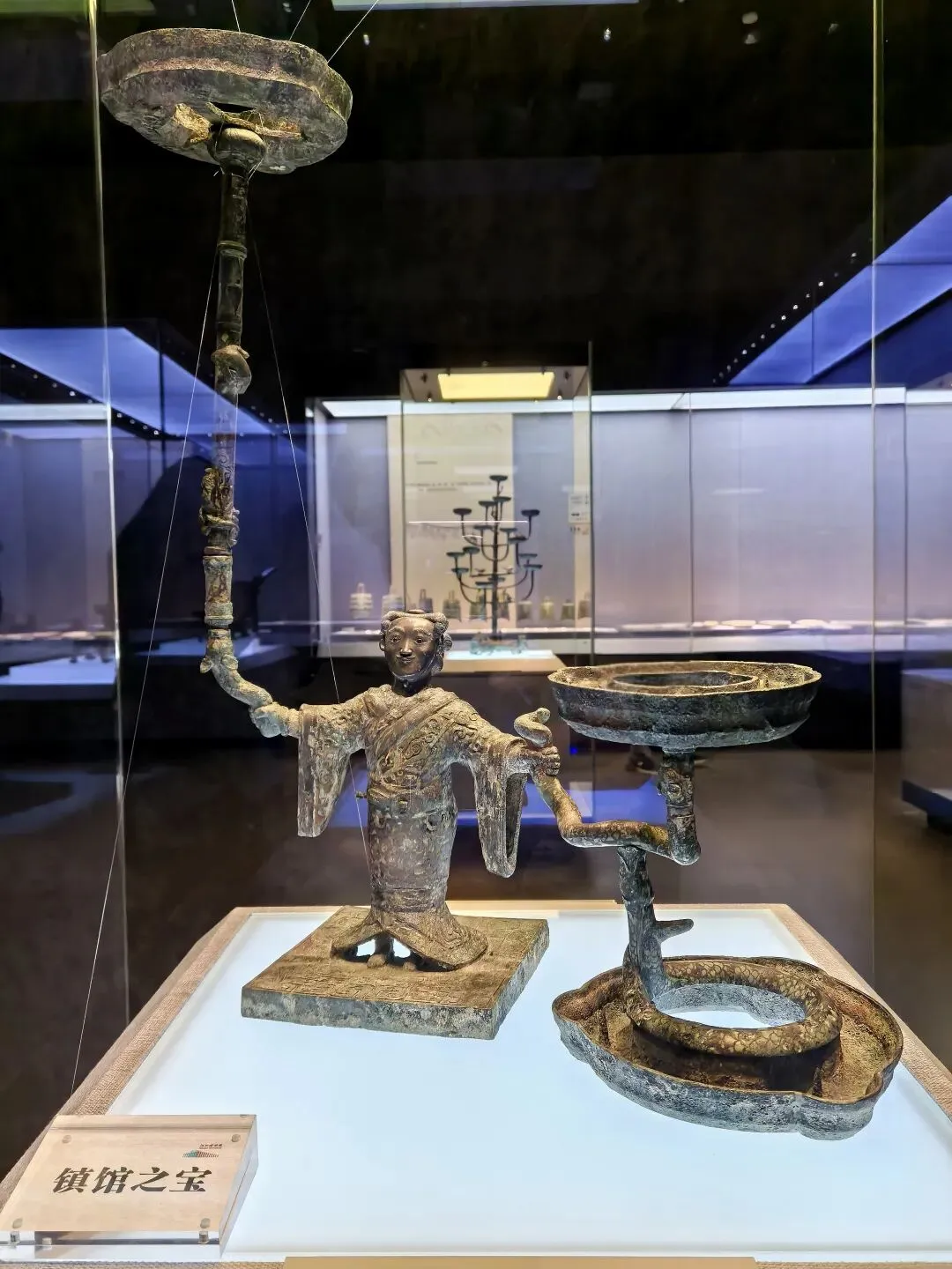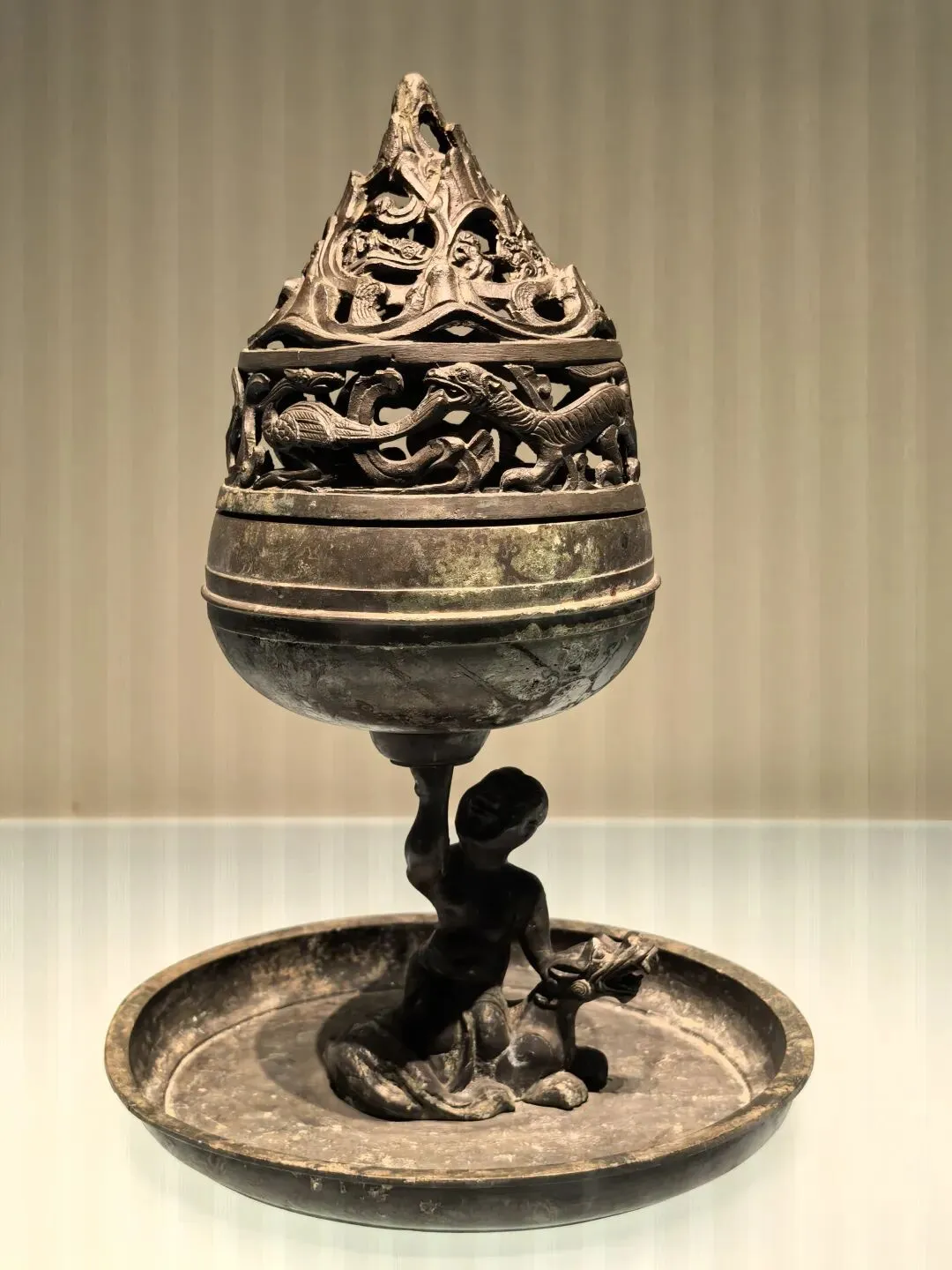 犀牛身躯肥硕,全身有错金银卷云纹,颈部饰有金线和银片构成的项带,黄白相间,绚丽夺目。犀牛背上有饰山羊面纹的銎(qiong)口,用以插放屏风扇。 镇席之器或国王跽(ji)坐时的扶手。兽颈前伸,脊背扁平,大肚低垂,四肢短粗,憨厚敦实,周身饰错金银卷云纹。耍蛇男子头为银制,黑宝石眼珠,胡须微翘,笑容可掬。其双手各握一条长蛇,两蛇头部分别擎住一只灯盘;底部灯盘内也蟠踞一蛇,蛇头顶住男俑左手之蛇,创意巧妙。 灯为树状,枝头十五只灯盘错落有致。树干上蟠(pan)绕一条螭(chi)龙,树枝间小鸟鸣啾、群猴嬉戏。圆形底座由三只独首双身的猛虎托起,底座上站立两个正在抛食戏猴的男俑。灯体可拆分为八节,每节榫头的形状各异,构思奇特。犀足蟠螭(pan chi)纹铜筒形器 中山王cuo墓出土 用途不详,可能是投壶或温酒器。器身满饰盘曲环绕的蟠螭纹;器足为三只周身刻卷云纹的犀牛,昂首张目,用力撑起筒身;犀牛与筒身的焊接严丝合缝。 盘壁饰卷云纹和三角纹,柱顶塑展翅的飞燕,简洁而流畅。 灯具:两墓共出土灯具64件,其中铜灯19件,铁灯1件,陶灯44件。陶灯和铁灯为常见的豆形灯,制作较粗糙,惟有铜灯造型多样,制作精美,具有很高的艺术造诣。 炉具:炉具包括熏炉和暖炉,熏炉用于焚草熏香,暖炉用于燎炭取暖。满城汉墓出土熏炉、暖炉各7件,其中2件"博山"造型的熏炉制作精美,为罕见的古代艺术珍品。 炉通体错金,底座透雕出三条腾空出水的蛟龙,炉身铸成山峦重叠的模样,山中神兽出没,虎豹奔走,猎人持弩巡猎其间,人与自然和谐一体。此炉制作精美,为罕见的古代艺术珍品。 日用杂器:满城汉墓出土了很多日用杂器,从中可知汉代人的家居用品已经很完备,有些物品一直沿用至今。 器身饰斜方格纹,格内嵌绿玻璃,方格交叉点设银乳钉,色彩绚丽,华贵逼人。从铭文可知,此壶初为甄氏所有,后一度收归朝廷,再后来转赐给刘胜。错金银鸟篆文铜壶