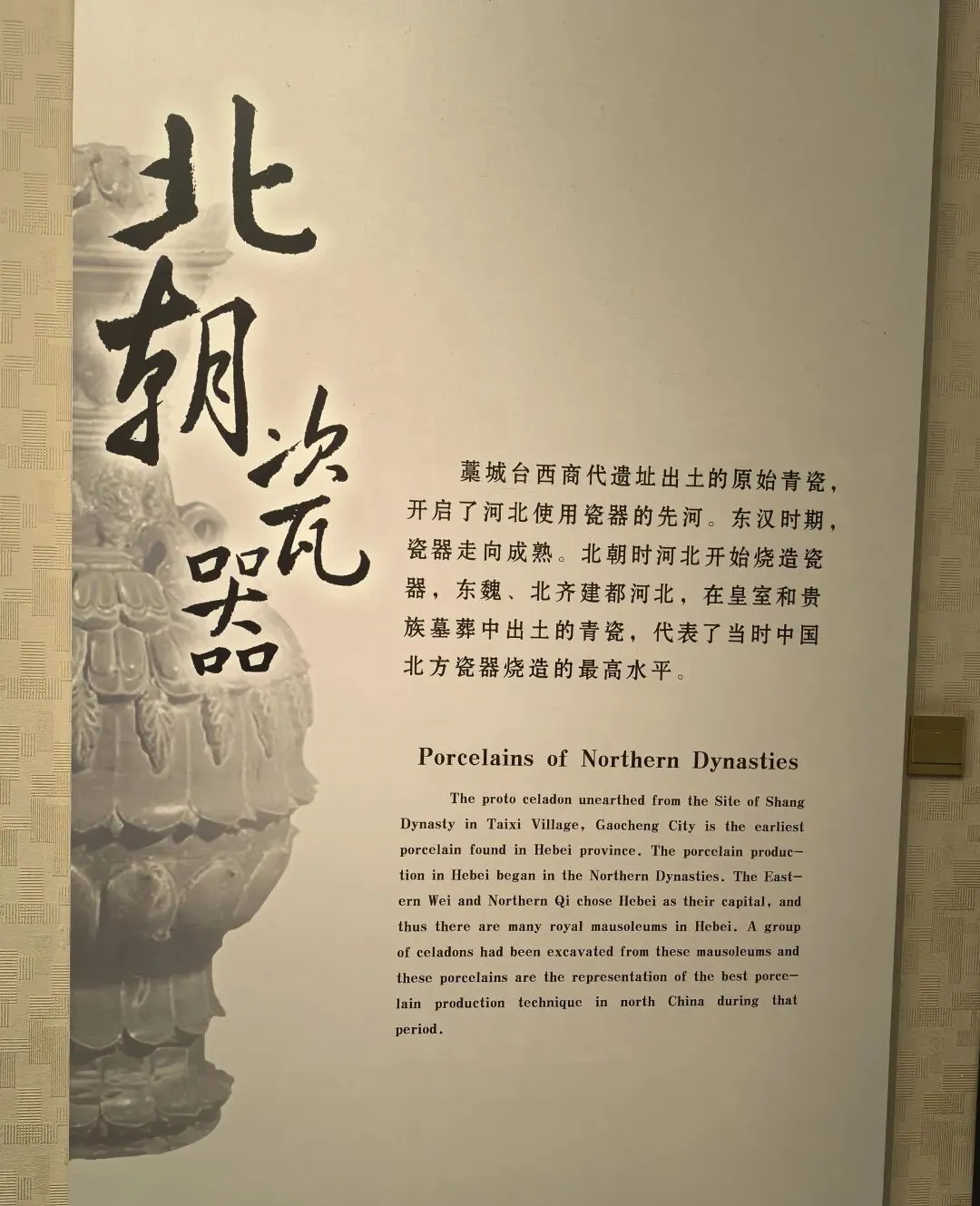 世界上许多国家最初正是通过瓷器来认识中国的,英语中的"瓷器"与"中国"即为同一单词CHINA。河北在中国瓷器史上举足轻重,早在三千多年前的商代,河北人就开始使用原始青瓷。至迟在北朝,河北人已在烧造瓷器。唐宋时期,河北系重要的瓷器产地,邢窑、定窑、磁州窑瓷器遍布国中,声名远播。元明清三代,河北地处京畿,因此,世界罕见的元瓷和明清官窑瓷器得以在河北流传收藏。