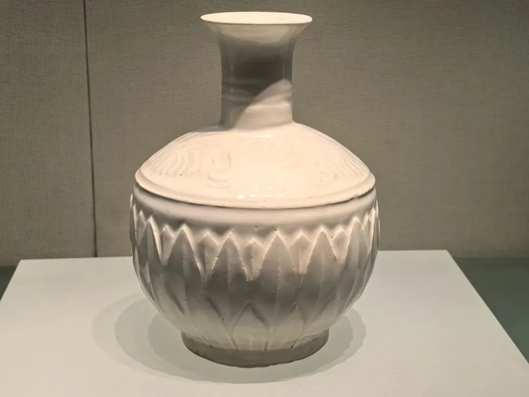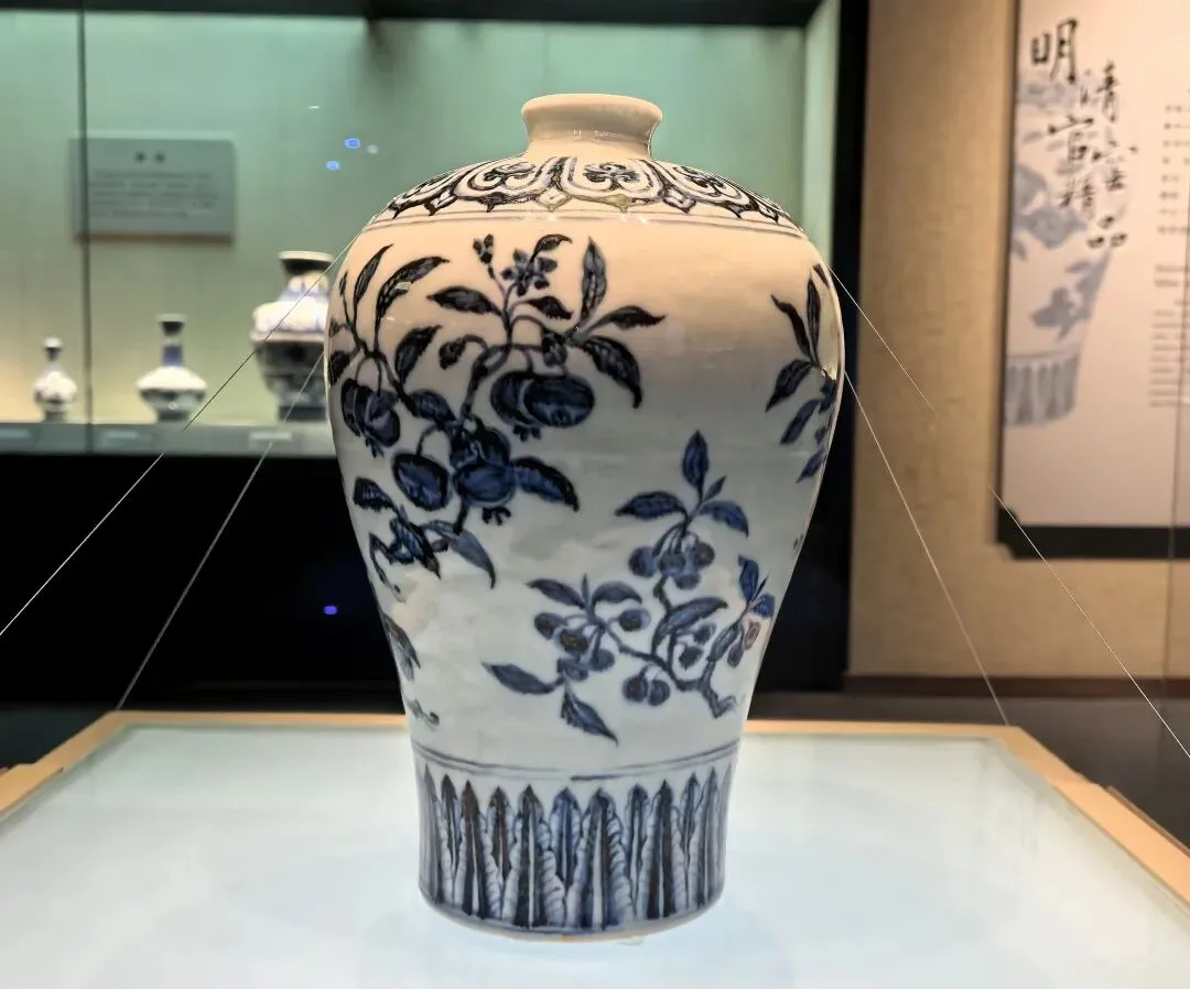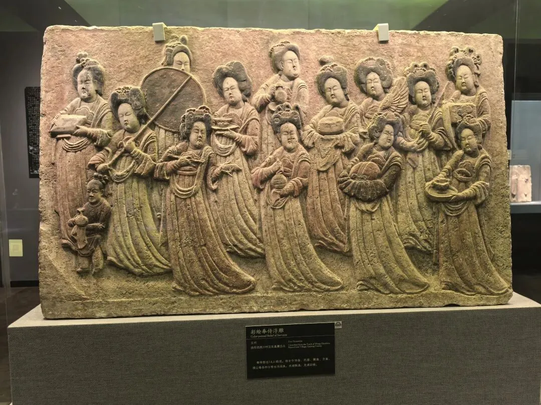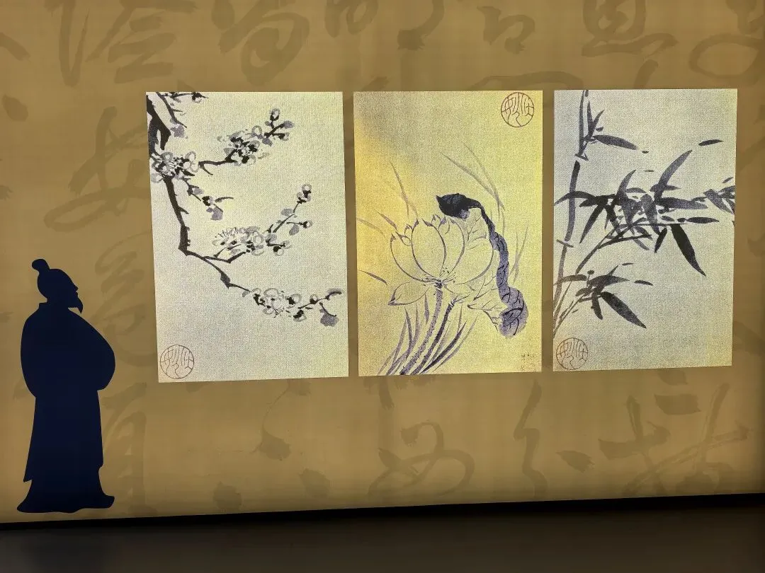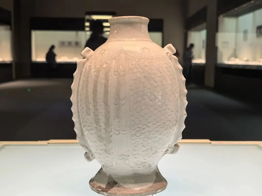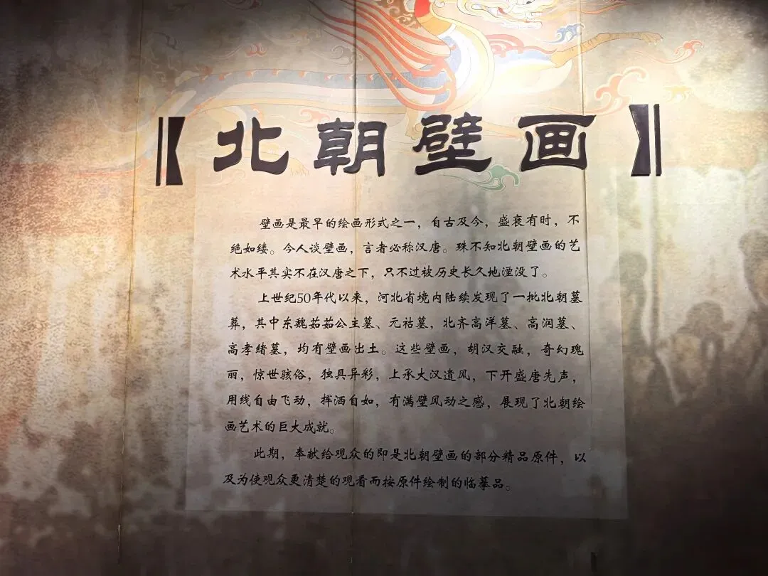 凤首壶是受萨珊波斯和粟特等地金银器中的带把壶影响而发明,流行于唐代。当时著名的窑场如邢窑、定窑、巩义窑烧造的白瓷以及三彩器中都出现过这种造型。壶呈连体双鱼形,鱼嘴是壶口,鱼尾为圈足。两侧贴塑双排鱼鳍,鳍面为凹槽,上下两端各有 定窑早期制品。五瓣花式盘口,胎质细腻,釉色莹润。圈足内划刻"官"字款,表明是官府定烧器物。 宋代定窑以覆烧法烧造瓷器时,因器口紧贴垫圈,形成无釉的"芒口"。为了弥补芒口的缺陷,就用金、银、铜等金属片包镶在口沿处,来美化器物。白釉刻花莲瓣纹长颈瓶 宋代 定州静志寺塔基地宫出土 胎质洁白细腻,釉色白中泛黄,积釉处有"泪痕"。盘内满印缠枝莲和折枝莲纹。白釉印花是宋金时期定窑最具代表性的产品,借鉴了当时名扬天下的定州缂丝艺术,构图严谨,满而不乱。 画面简洁空灵,寥寥数笔,将恬静的乡村景象和儿童天真可爱的神态表现得淋漓尽致。瓷枕底部压印"张家枕"戳记。青花釉里红开光贴花盖罐 元代 保定永华南路小学出土(镇馆之宝) 1964年,保定市永华南路小学元代窖藏出土了11件瓷器,有青花瓷、卵白釉瓷和蓝釉描金瓷器,是国内首次发现的成批元代青花瓷。青花釉里红开光贴花盖罐造型浑厚,青花浓艳,装饰花纹达10余层,集绘画、浮雕、贴塑、青花、釉里红等多种技法之大成,是存世元青花中的顶级艺术珍品。青花海水龙纹八棱带盖梅瓶 元代 保定永华南路小学出土 肩、颈部饰如意云纹,云纹内有花卉、凤鸟及怪兽。腹部龙纹采用"留白"手法装饰,四条白龙在蓝色海浪中遨游翻腾,别有意趣。 蓝釉描金,是元代景德镇创造的特殊装饰技法。先用高温烧制成蓝釉器物,而后用金彩描绘纹饰,再入窑炉低温烘烤。元代蓝釉瓷器仅存世10余件,描金器物更为罕见,是元瓷中的精品。青花双狮戏球纹八棱玉壶春瓶 元代 保定永华南路小学出土 北朝壁画:壁画是最早的绘画形式之一,自古及今,盛衰有时,不绝如缕。今人谈壁画,言者必称汉唐。殊不知北朝壁画的艺术水平其实不在汉唐之下,只不过被历史长久地湮没了。上世纪50年代以来,河北省境内陆续发现了一批北朝墓葬,其中东魏茹茹公主墓、元祜墓,北齐高洋墓、高润墓、高孝绪墓,均有壁画出土。这些壁画,胡汉交融,奇幻瑰丽,惊世骇俗,独具异彩,上承大汉遗风,下开盛唐先声,用线自由飞动,挥洒自如,有满壁风动之感,展现了北朝绘画艺术的巨大成就。此期,奉献给观众的即是北朝壁画的部分精品原件,以及为使观众更清楚的观看而按原件绘制的临摹品。 散乐图有人物15人。乐伎丰腴圆润,均梳高,簪珠花、长裙、披帛巾,持笛、琵琶、响板、箜篌(kong hou) 等乐器。司仪戴幌(rm)头,持长杆指挥众女合奏。前有孝子二人。 奉侍图由14人组成。侍女手持壶、托盏、障扇、方盒、拂尘等各种日常生活用具,衣裙飘逸,充满动感。 茹茹公主墓甬道东壁壁画﹣﹣侍卫。壁画宽1.57米,高1.93米,右侧人物头戴平巾帻,身穿广袖红衫,从姿态上看,应是拥剑侍卫;左侧人物头上扎巾,身穿窄袖衫,双手执鞭,应为驭手。 石家庄市博物馆正在展出《墨承风骨 明清华章-石家庄市博物馆藏明清书画精品展》。 壹:明代风雅-承古开新的笔墨意境。明代书画在继承元人传统的基础上,逐渐形成多元化的艺术格局。早期延续宋元遗风,中期以吴门画派、书家的兴起为代表,倡导文人意趣,后期则涌现出追求个性解放、风格奇崛的艺术家。本单元通过展示明代不同时期、不同流派的书画作品,呈现明代艺术承古开新、雅俗共赏的时代风貌。