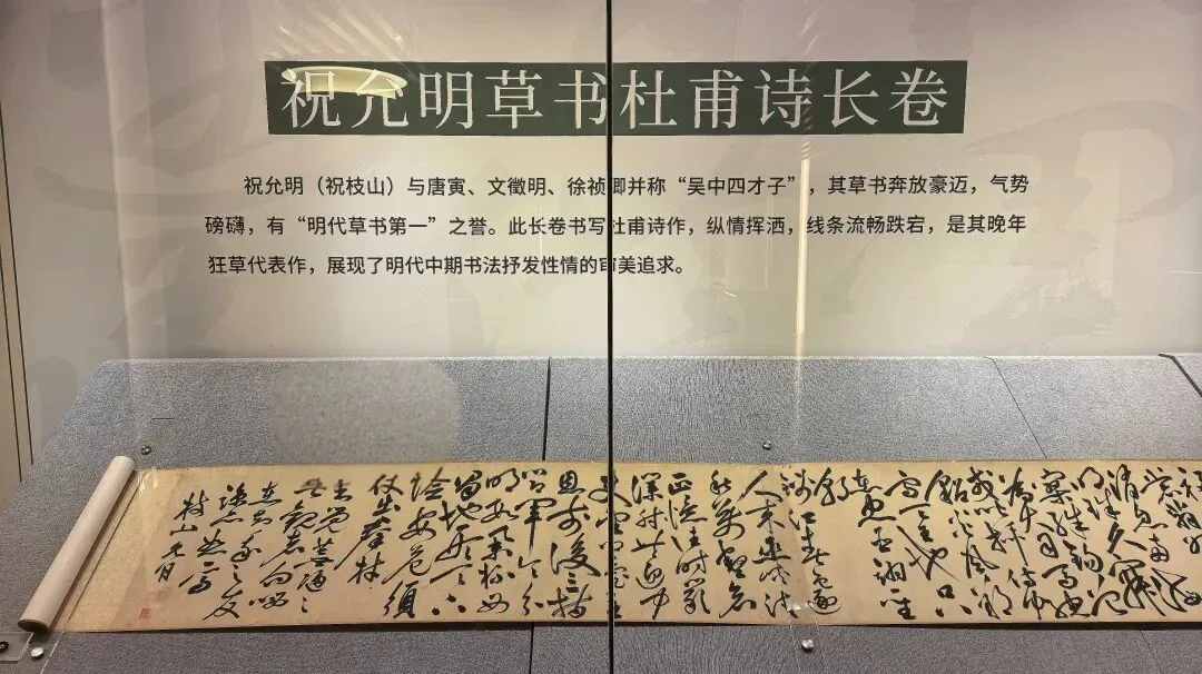 祝允明(祝枝山)与唐寅、文徵明、徐祯即并称"吴中四才子",其草书奔放豪迈,气势磅礴,有"明代草书第一"之誉。此长卷书写杜甫诗作,纵情挥洒,线条流畅跌宕,是其晚年狂草代表作,展现了明代中期书法抒发性情的审美追求。
