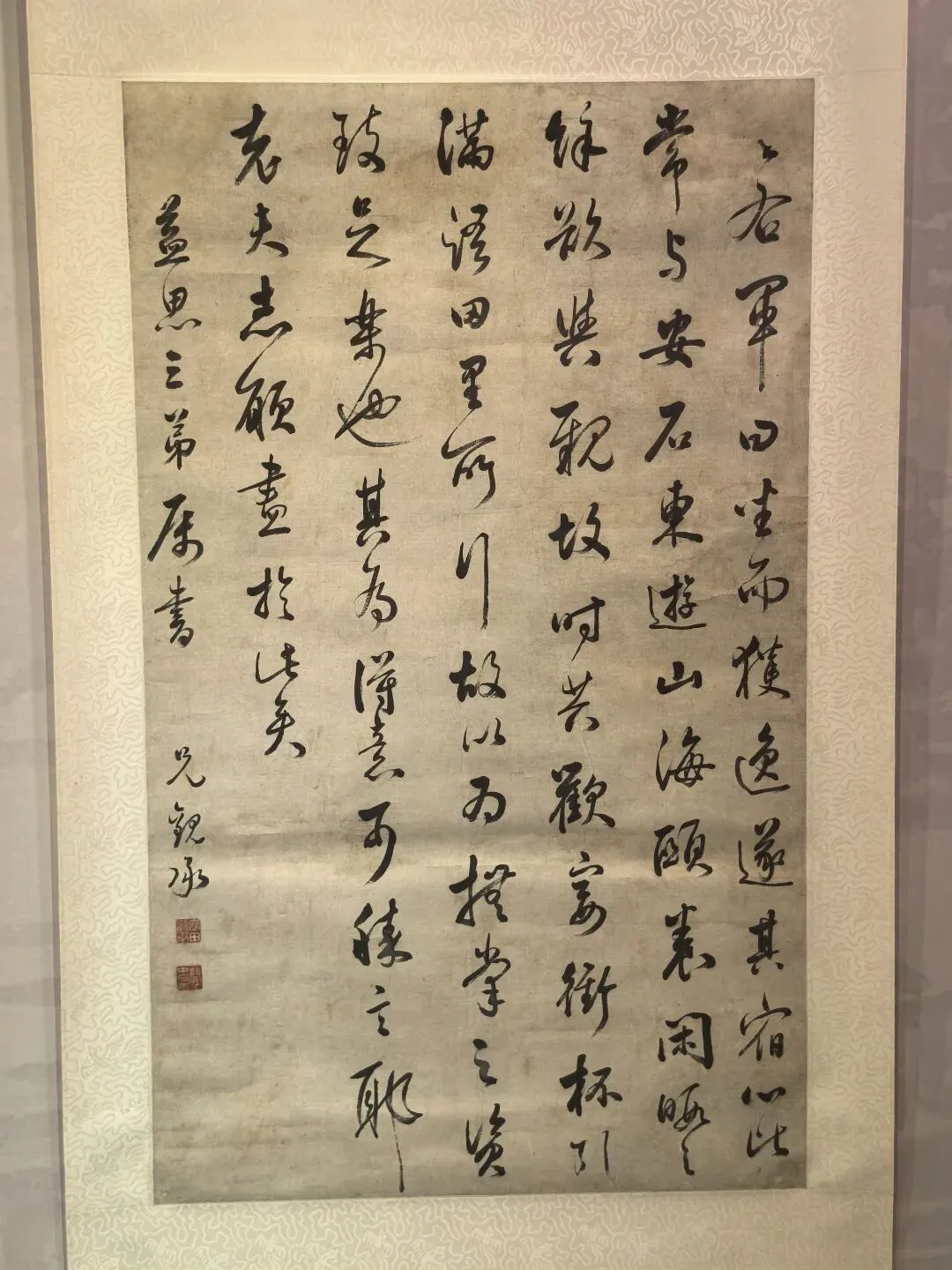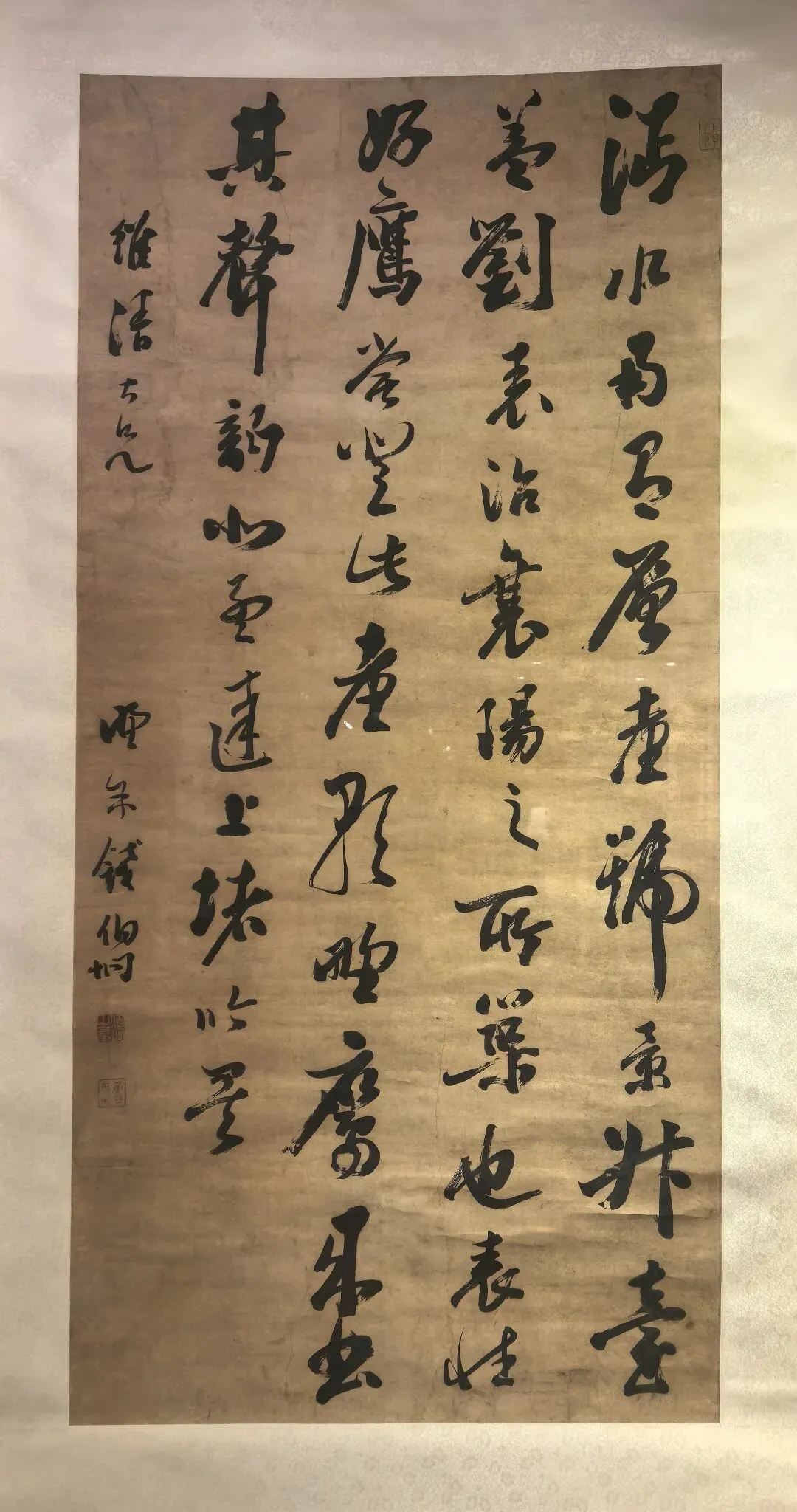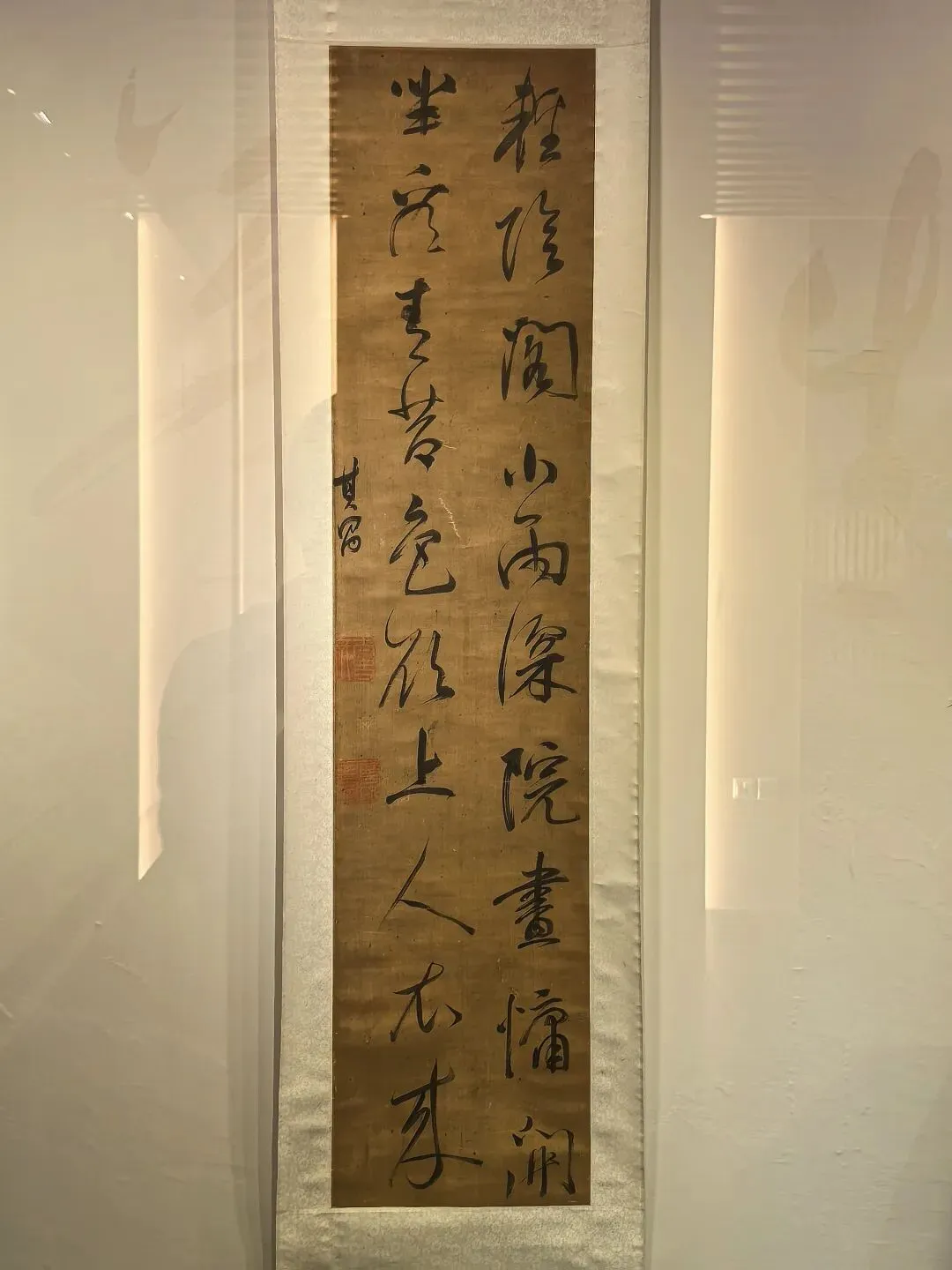 董其昌是晚明华亭派代表人物,其书法兼收晋唐诸家,尤得力于颜真卿、米芾,崇尚"淡雅"书风。此轴草书用笔精到,气息古淡空灵。