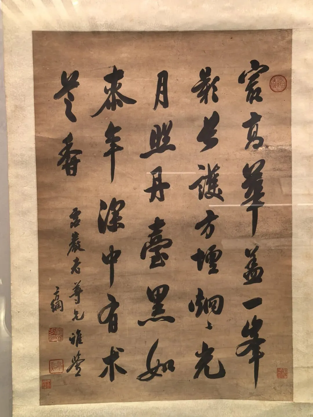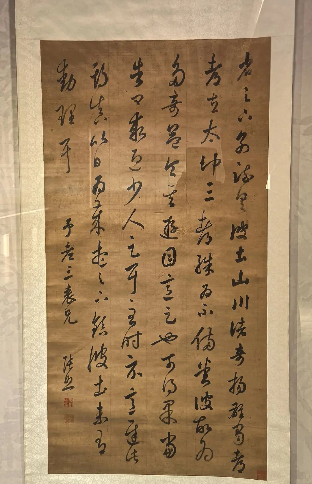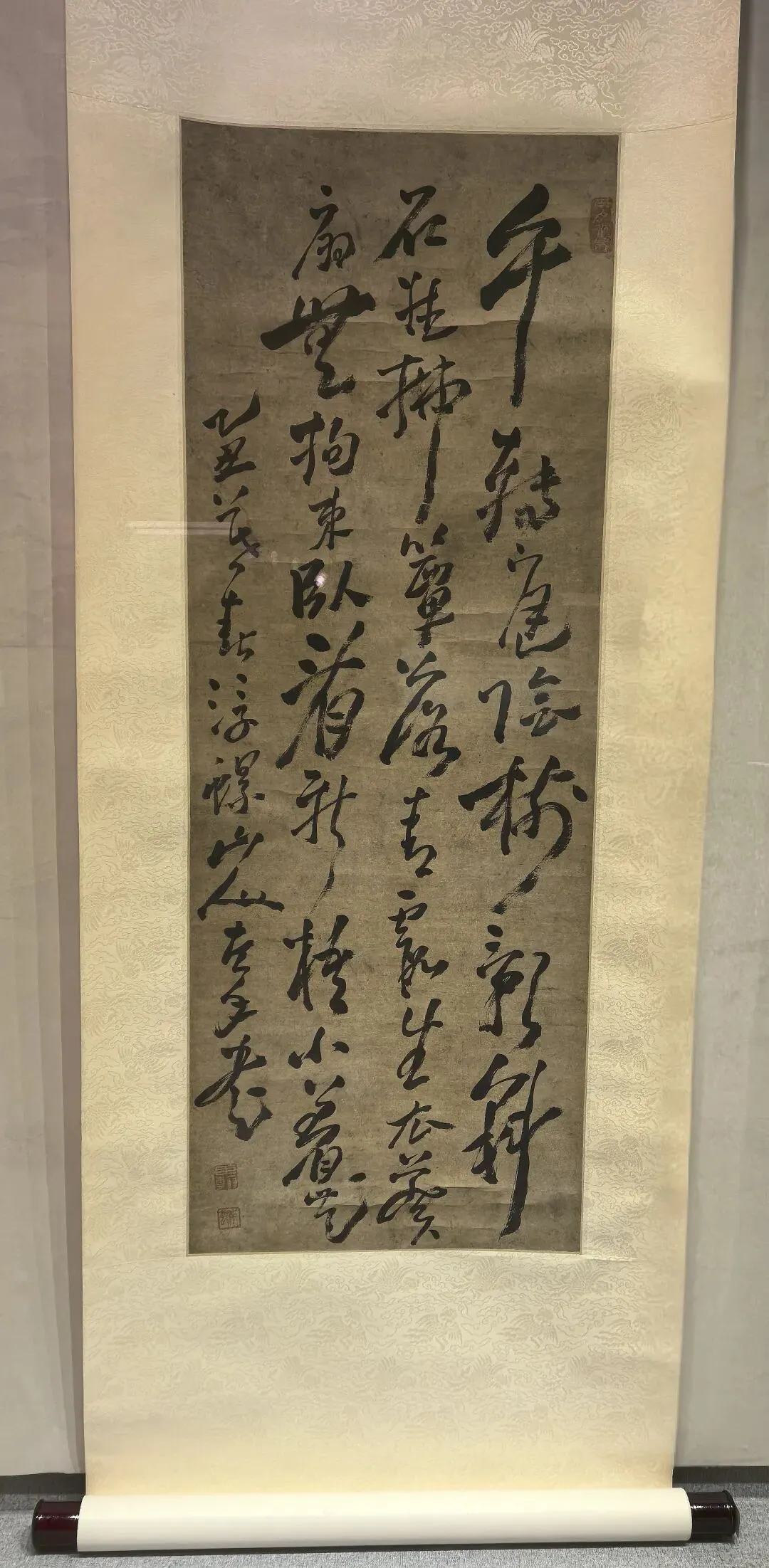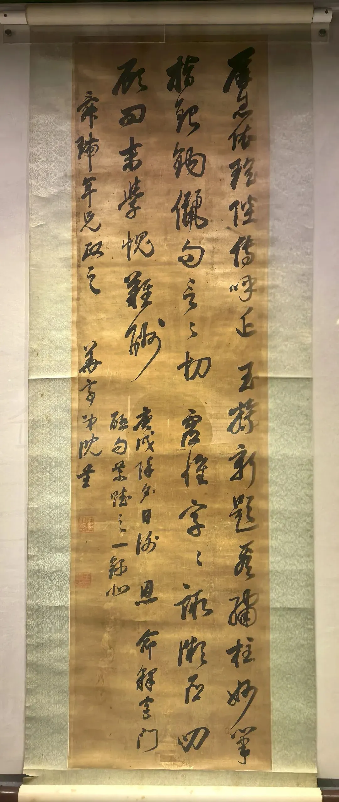 董其昌是晚明华亭派代表人物,其书法兼收晋唐诸家,尤得力于颜真卿、米芾,崇尚"淡雅"书风。此轴草书用笔精到,气息古淡空灵。
