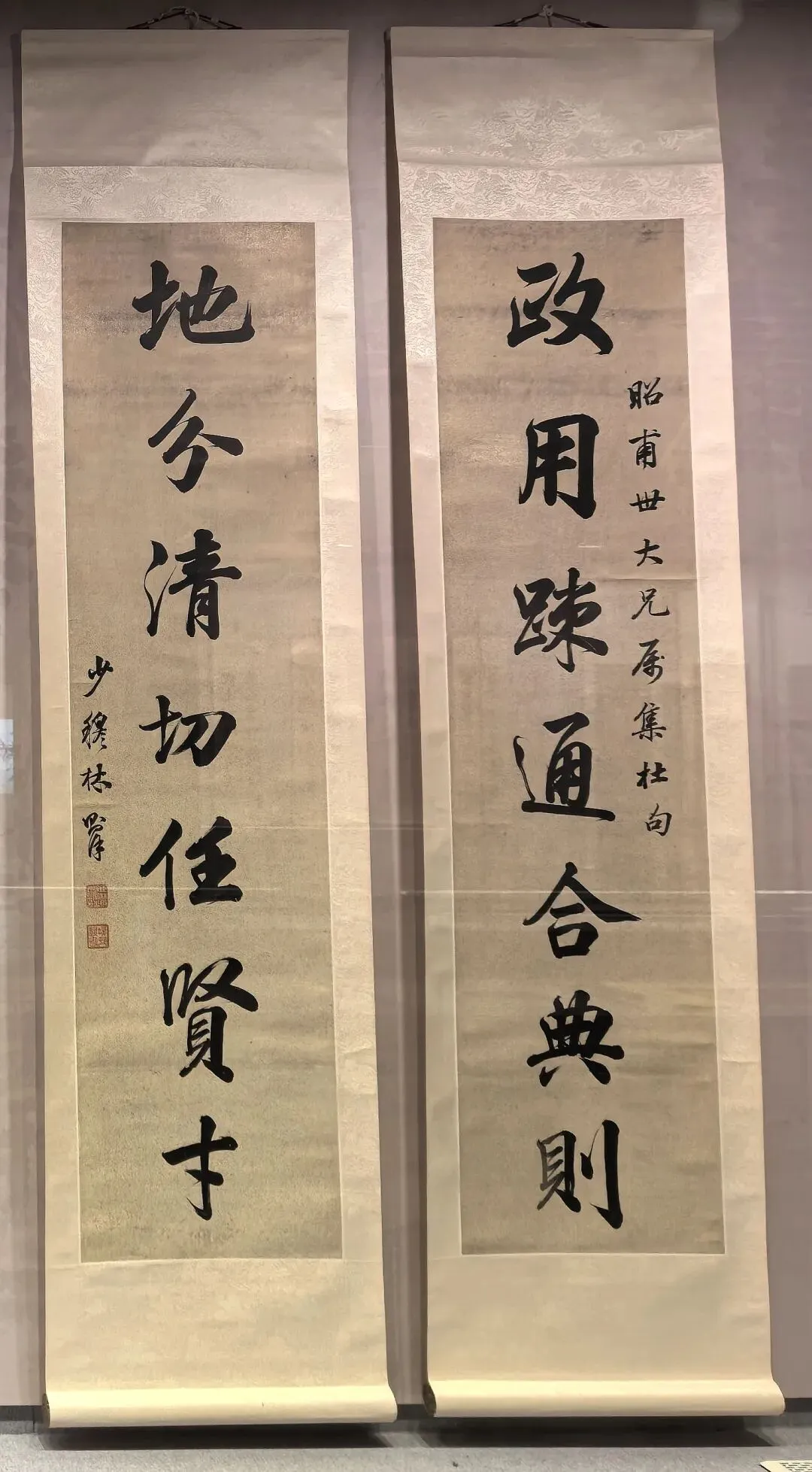 林则徐(1785~1850年),字元扶,一字少穆,福建侯官人,嘉庆六年(1811年)进士。此联作于他去世前半年。诗联后署:少穆林则徐。上联出自杜甫诗《入奏行赠西山检察使窦使御》,下联出自《赠献纳使起居田舍人澄》诗。两句杜诗经他信手拈来,凑成一联,可谓点铁成金。政治通达,循守遵依典章法则,选官授职,任贤用能人尽其材,正是他所向往的政治清明。