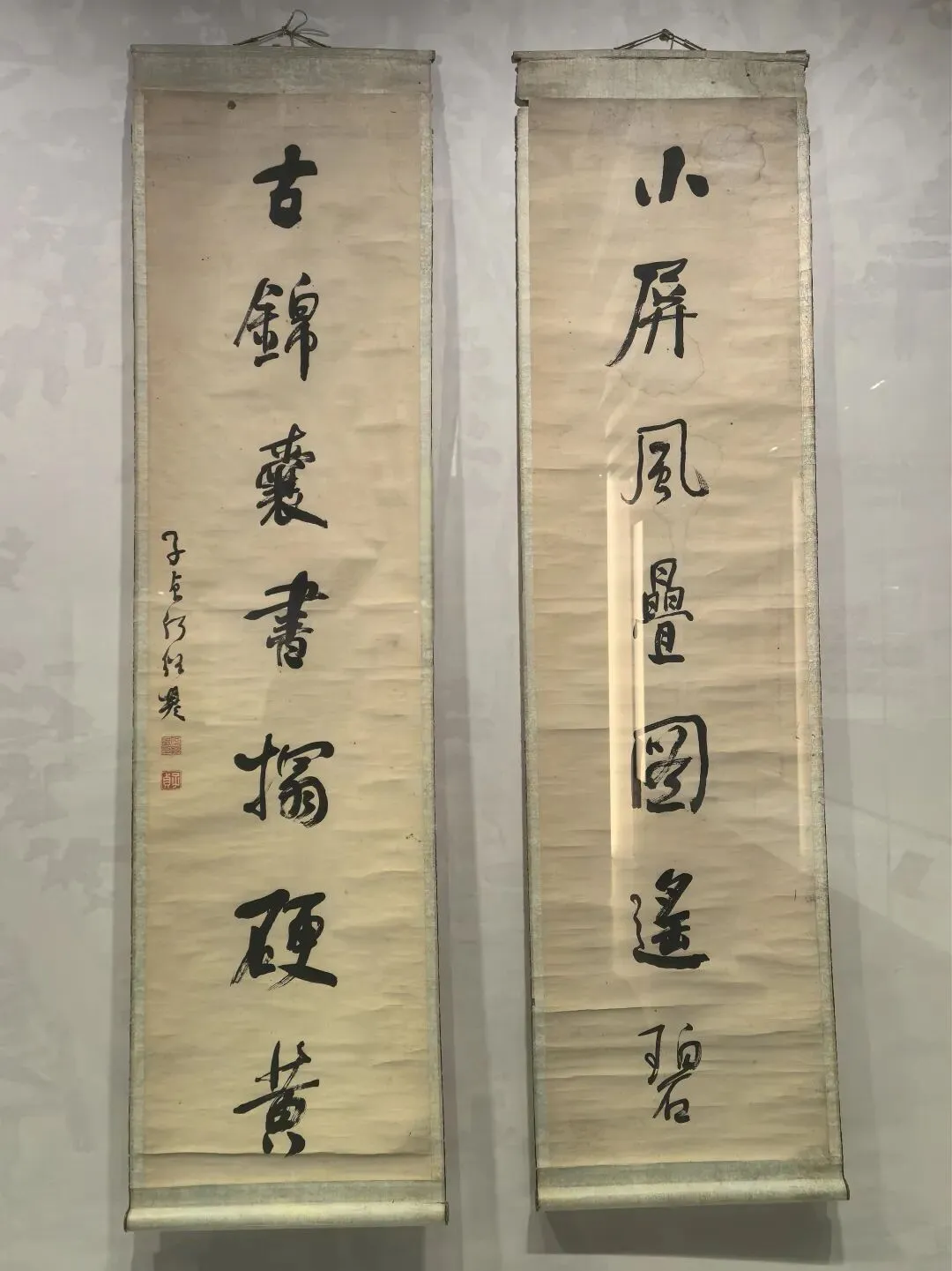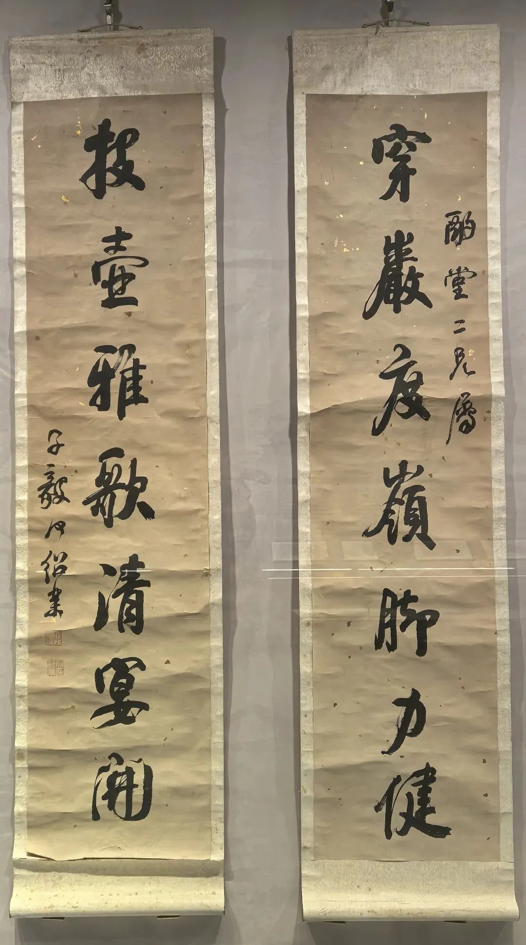 何绍基(1799~1873年),字子贞,号东洲,晚号媛叟,清代诗人、书法家,湖南道州人官编修。他兼工篆、隶、楷、行四体,书法得力于《礼器碑》《张迁碑》《张黑女墓志》。他用回腕法执笔,保持了中锋入纸,又略带战掣,形成奇拙生动的特殊效果。此联书体行书中参有篆意,于纵横倚斜中见规矩,恣肆中透着秀逸之气。