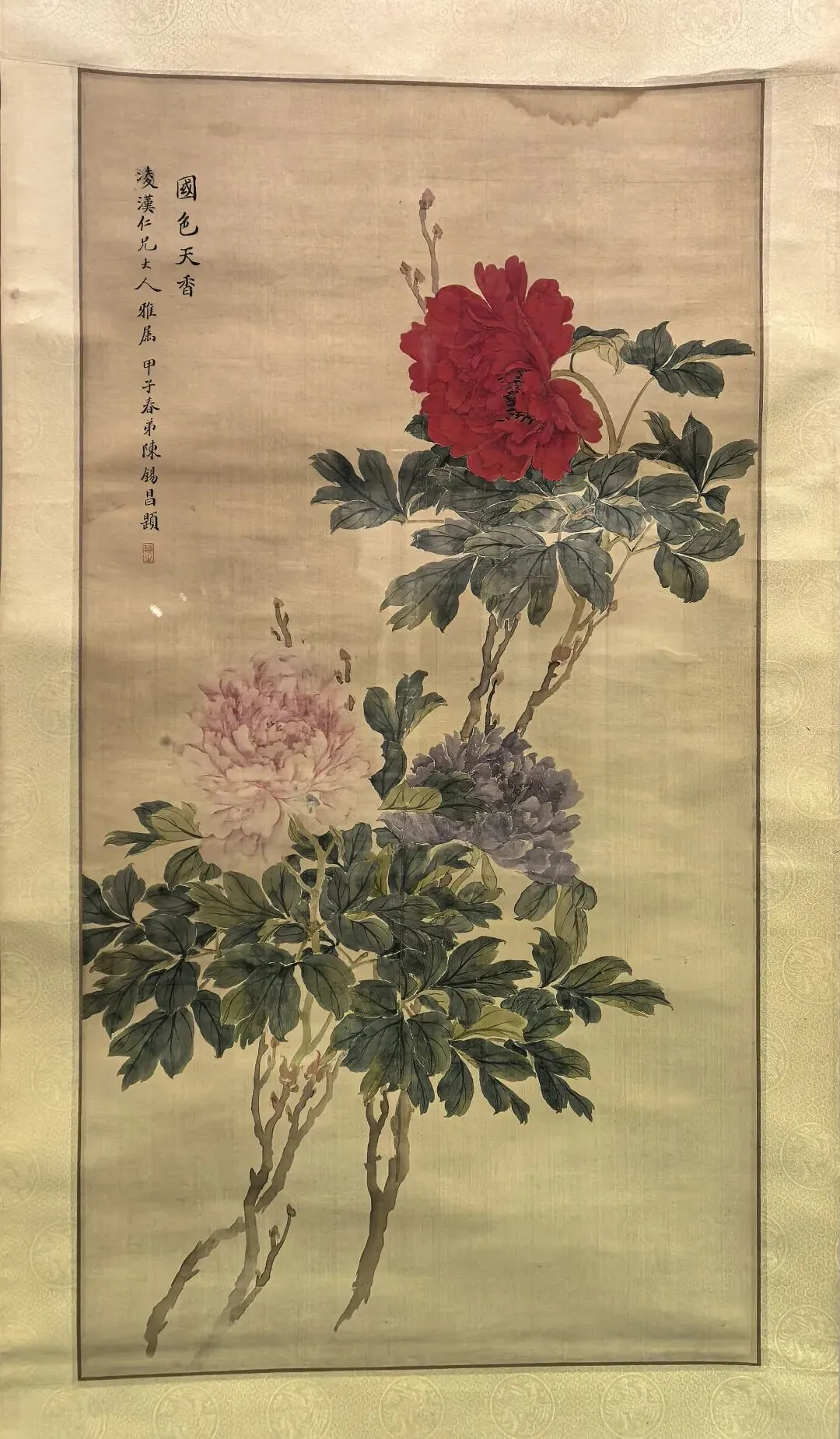 陈锡昌,清代画家,确切生平不可考。该图绢本立轴,以工笔重彩绘折枝牡丹,笔法细腻,色彩饱满,明丽动人,尽显"雍容华贵"的文化意象,既是自然形貌的摹写,也是文化精神的物化。