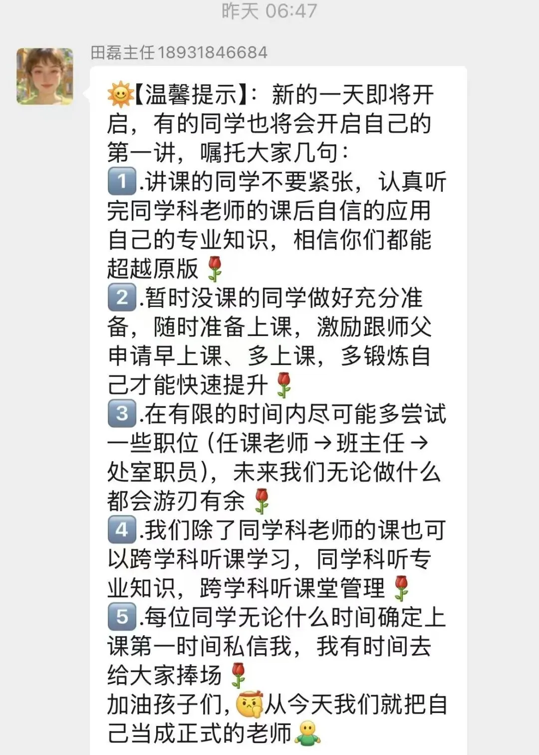 更让队员们倍感温暖的是老师们的悉心关怀:从提前为他们打开宿舍门、主动帮忙搬运行李,到课前暖心的话语,叮嘱队员们放平心态、大胆实践,再到鼓励他们多录课、多复盘、多成长,每一条消息、每一句嘱托,都饱含着对他们的期许与爱护。这份食宿无忧的安心与师者相伴的温情,让队员们能以更饱满的状态投入教育实践,踏实前行。