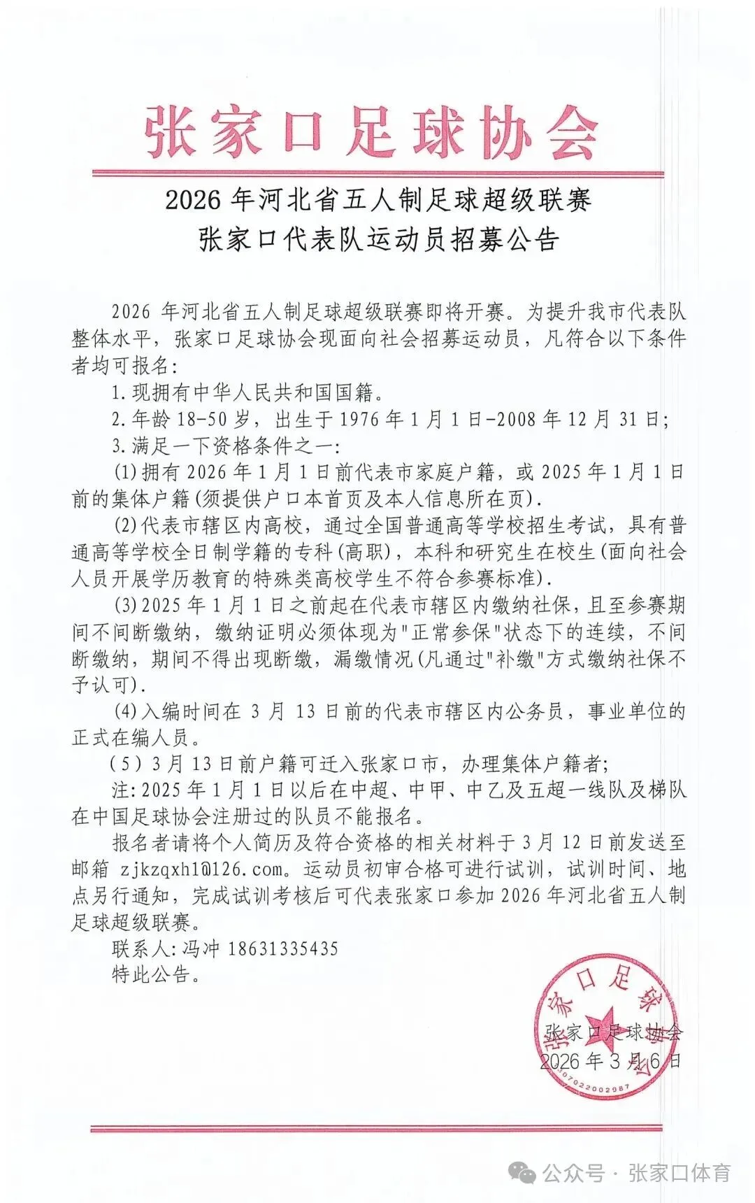 绿茵燃情,逐梦同行!为全力备战2026年河北省五人制足球超级联赛,充分展现张家口足球运动的激情与风采,打造属于张家口的城市体育名片,凝聚全城足球力量,现面向全市公开招募优秀五人制足球运动员,组建张家口代表队,并肩征战省级赛场,书写家乡足球新篇章!