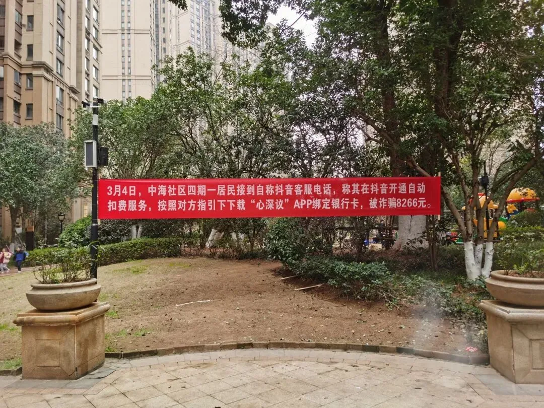 更让我心惊的是,第二天我带娃出去玩,小区门口挂着一个反诈横幅,写得清清楚楚:
