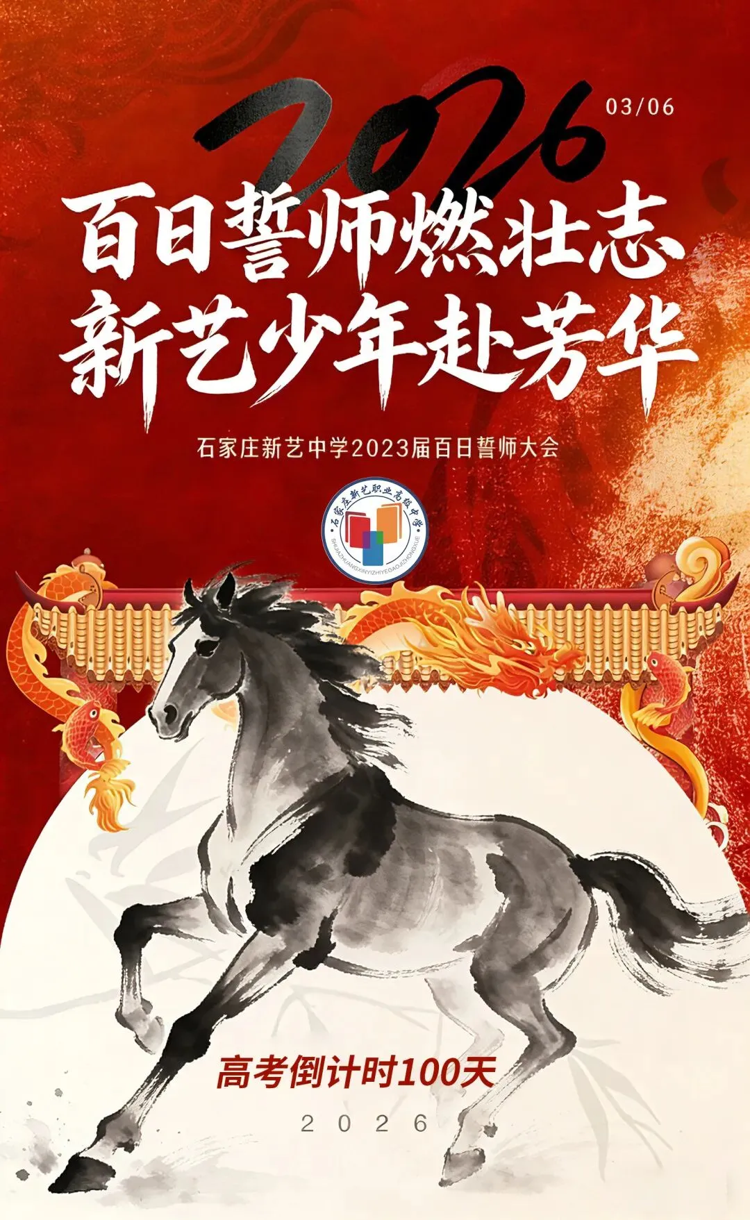 当最后一声誓言响彻校园,当每一份祝福传递心间,石家庄新艺中学2023届高三百日誓师大会圆满落幕。但这不是结束,而是百日冲刺的正式开始。愿全体高三学子以今日为起点,以誓言为动力,以笔为剑、以勤为径,用汗水浇灌希望,用拼搏书写华章,在六月的考场上绽放青春光芒,不负韶华、不负梦想,奔赴属于自己的盛夏荣光!