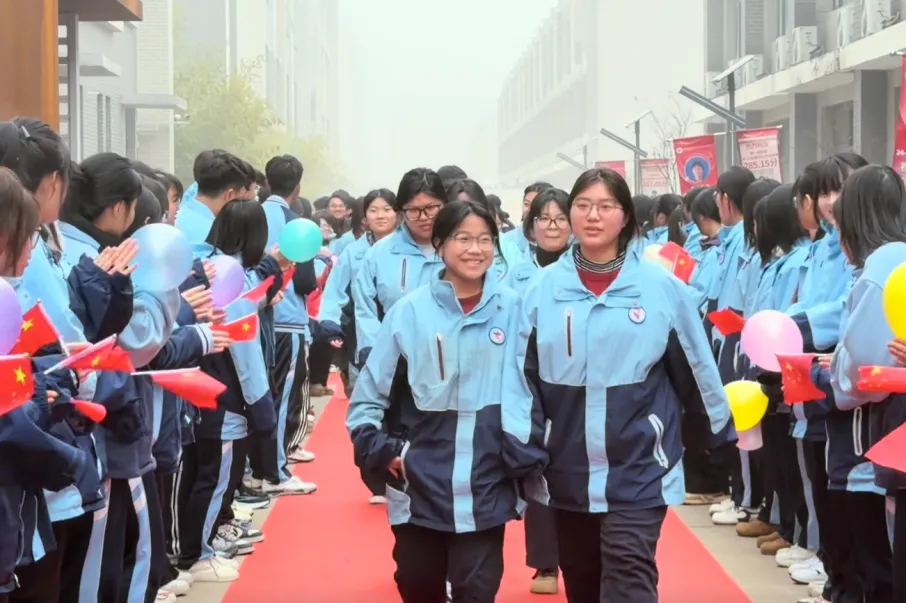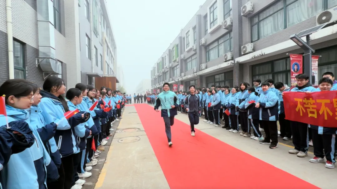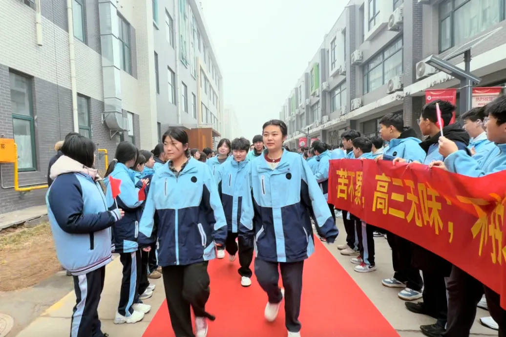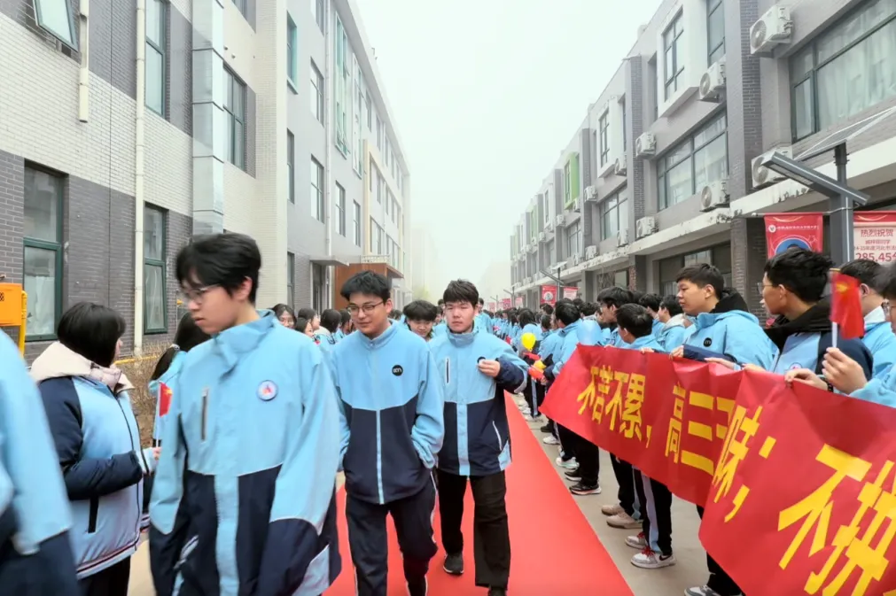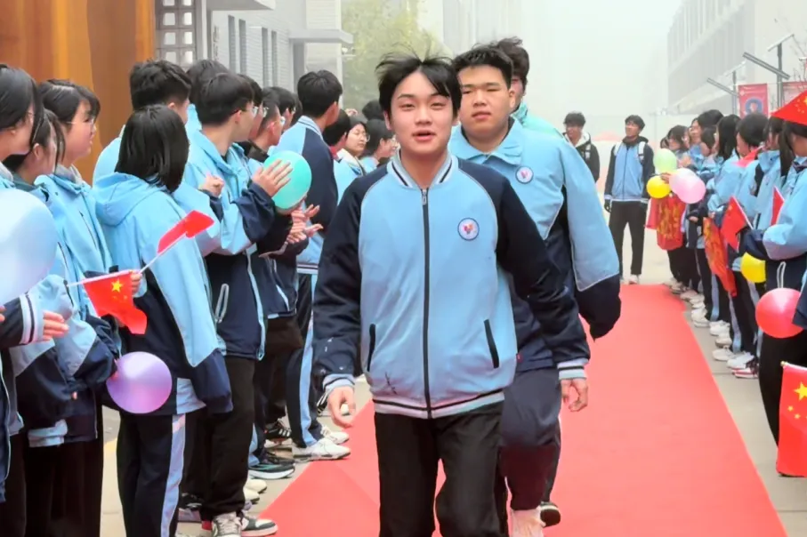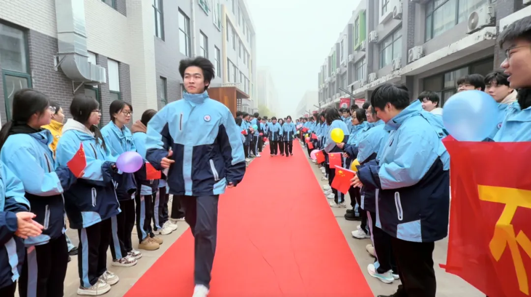 校园主干道上,红毯笔直延伸,如一道通往梦想的光途。高一、高二的学弟学妹们身着笔挺校服,手持写满祝福的标语牌,分列红毯两侧,以最昂扬的姿态夹道相迎。