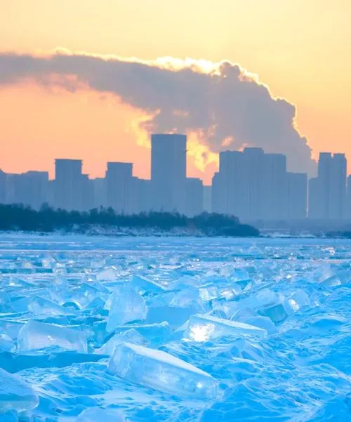 石家庄的雾凇确实也美,但那是另一个路数,是水汽在树枝上慢慢凝结出来的,一层一层包上去,远看像给树裹了件白毛衣,近看是绒毛状的细碎冰晶。可这种美有个问题,它要的是温度不上不下刚刚好,太冷水汽凝结不上去,太暖又化了,所以雾凇这东西讲究天时,不是你想看就能看到的,得碰运气。而哈尔滨的冰不一样,冰城的冰是稳定输出的,从十一月冻到来年三月,松花江上的冰层能长到一米多厚,你站在上面跺脚都纹丝不动,这种扎实感是雾凇给不了的。