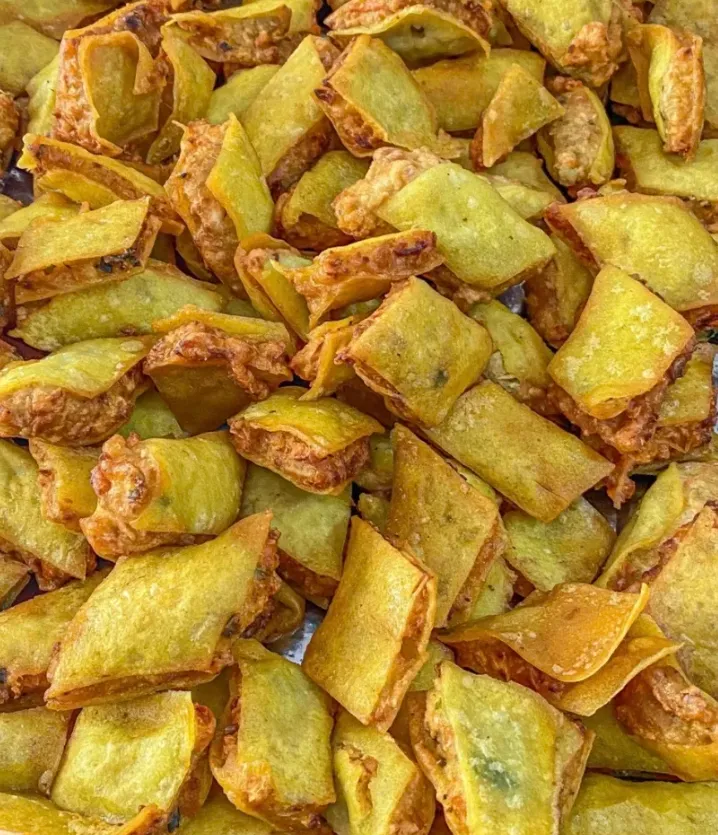 重点说说这饹馇。这可是唐山一带的灵魂。用绿豆面做成薄饼,切成块。做法多样,能烩能炒,但我最推崇"炸饹馇盒"。两片饹馇中间夹上肉馅,扔进油锅里滚一遭。捞出来时金黄酥脆,咬下去"咔嚓"一声,面皮的焦香混着肉馅的滚烫汁水,在嘴里"呲"地炸开。别急着咽,烫嘴,但那股子豆香,能让你记很久。