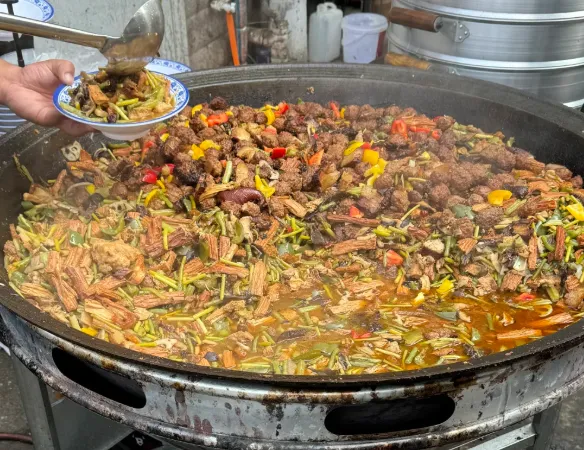 还有一种不得不提的“大锅菜”。这菜没法精致,也不讲究摆盘。大白菜、海带、炸豆腐、粉条和五花肉,在巨大的铁锅里慢炖。所有的食材都吸饱了汤汁,肉烂味香。这菜吃的是一种热闹,一种把所有隔阂都炖化了的亲切感。
