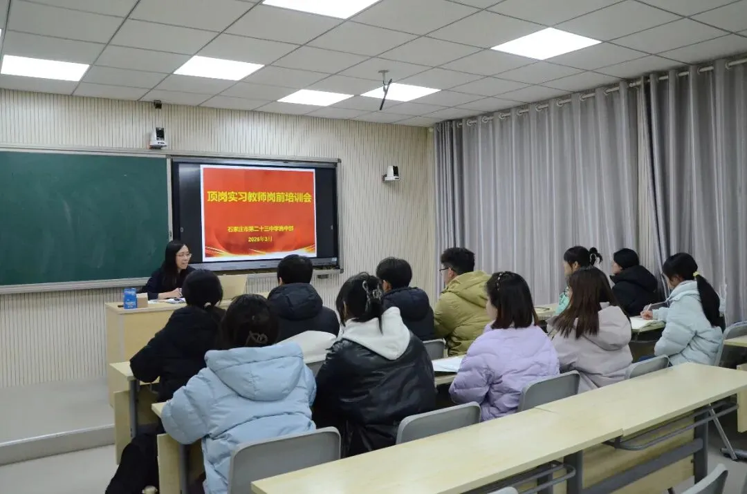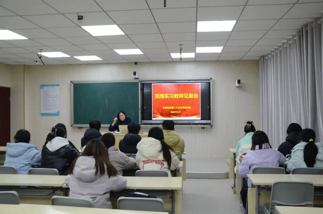 春风拂岸,草木新生。3月4日,河北师范大学42期顶岗实习冀石新锋队11名实习教师抵达石家庄市第二十三中学高中部。为帮助实习教师尽快适应角色、融入集体,学校精心组织了一系列培训活动:从隆重的见面会,到干货满满的岗前教学指导,再到校领导的殷切寄语和年级主任的细致部署,环环相扣,全方位助力实习教师迈好职业生涯第一步。让我们一起回顾这些精彩瞬间,感受教育薪火的传递。