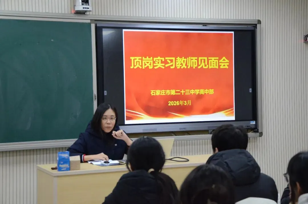 在温馨而庄重的见面会上,特聘名师欧阳卓老师热情欢迎实习教师的到来,并全面介绍了学校情况与实习安排。石家庄二十三中是一所完全中学,拥有五个校区,河北省示范性高中,为实习教师提供了广阔的锻炼平台。