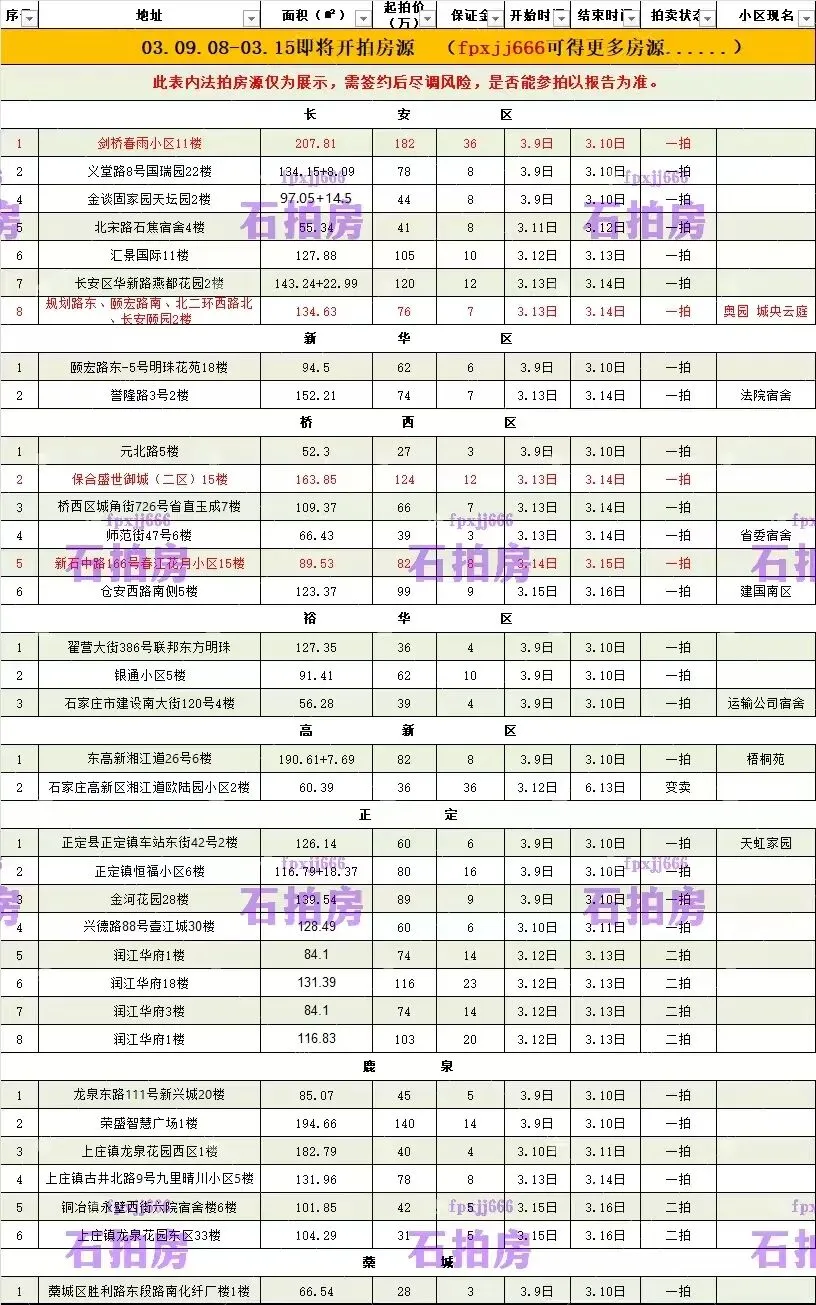 下周即将开拍房源,大家及时关注开拍日期,别错过,有任何问题,请微fpxjj666咨询!!!重点推荐房源有:奥园、剑桥春雨、盛世御城、春江花月等此表内房源仅为展示,需签约后尽调风险,是否可参拍以报告为准,请知悉。石拍房,买法拍,无风险,有保障!