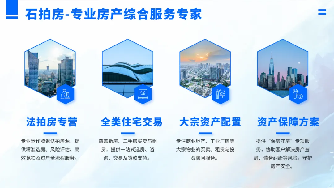 鉴于法拍房市场风险复杂,买家往往难以察觉潜在隐患,也缺乏解决风险的能力,因此更需要多加注意。石拍房,可为您提供法拍一站式服务。无论您是个人还是公司购房,是自住需求还是投资考量, 我们都能依据您的预算和实际情况,精准推荐优质房源标的,石拍房将对标的物进行全面评估,助您安心省心置业。