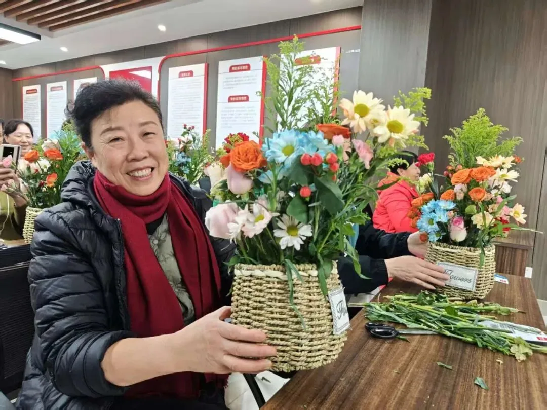 活动现场花香四溢,欢声笑语不断。现场滚动播放插花教学视频,参加活动的阿姨们兴致盎然地学习选花、修剪、搭配与造型。大家一边交流插花技巧,一边畅谈退休生活的点滴趣事,在馥郁芬芳中感受着创作的愉悦和节日的喜悦。巧手翻飞间,一篮篮错落有致、生机盎然的插花作品逐渐成型,每一件都寄托着对美好生活的热爱与追求。